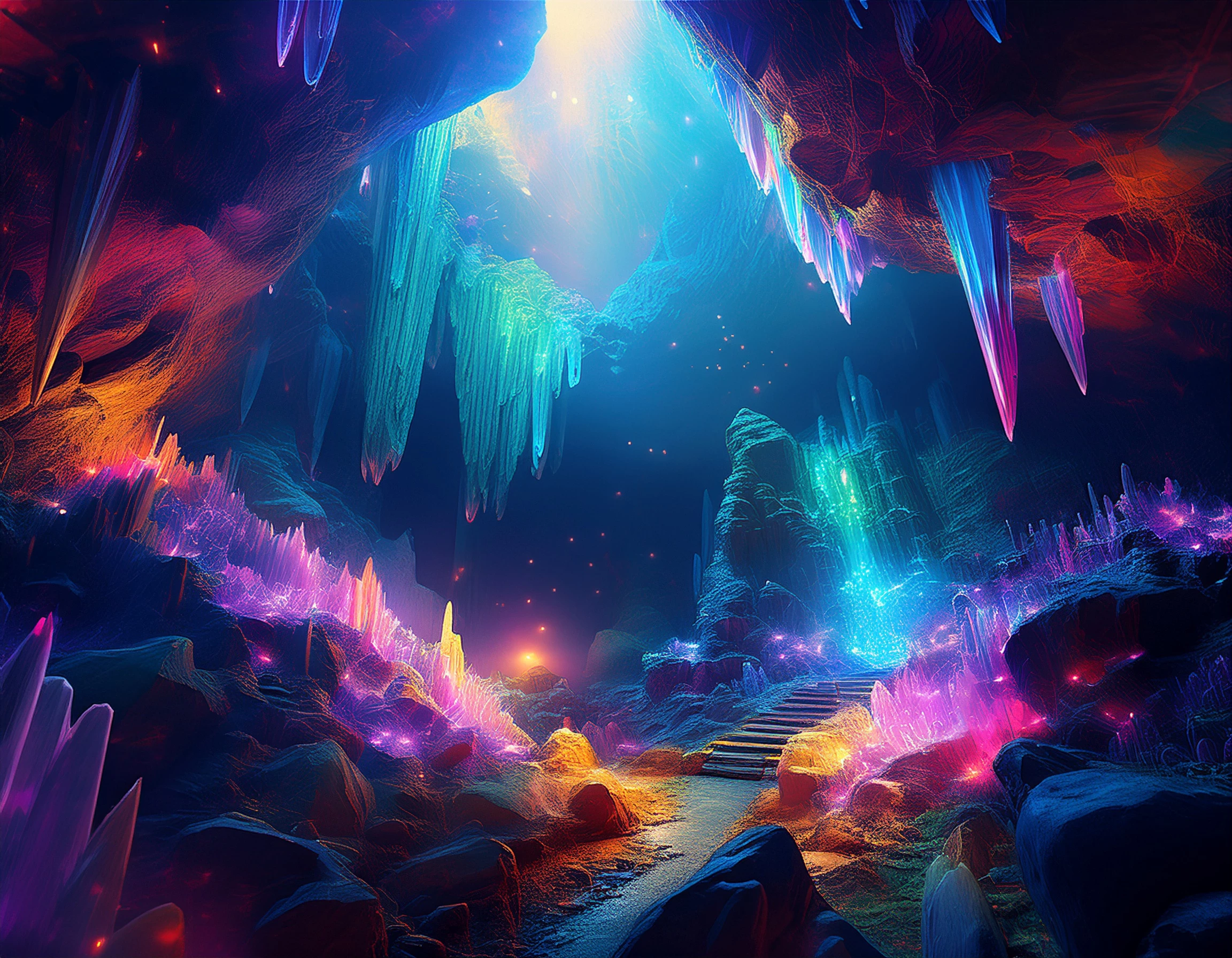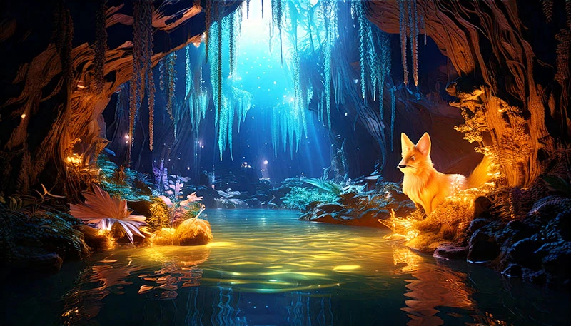 A luminous cave alive with glowing crystals, enchanted flora, and shimmering mist. A radiant pool reflects the magical glow, as ethereal creatures - translucent fox. Vines of golden light drape from above, filling the space with wonder.