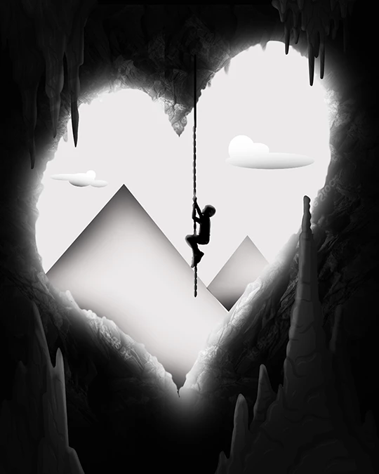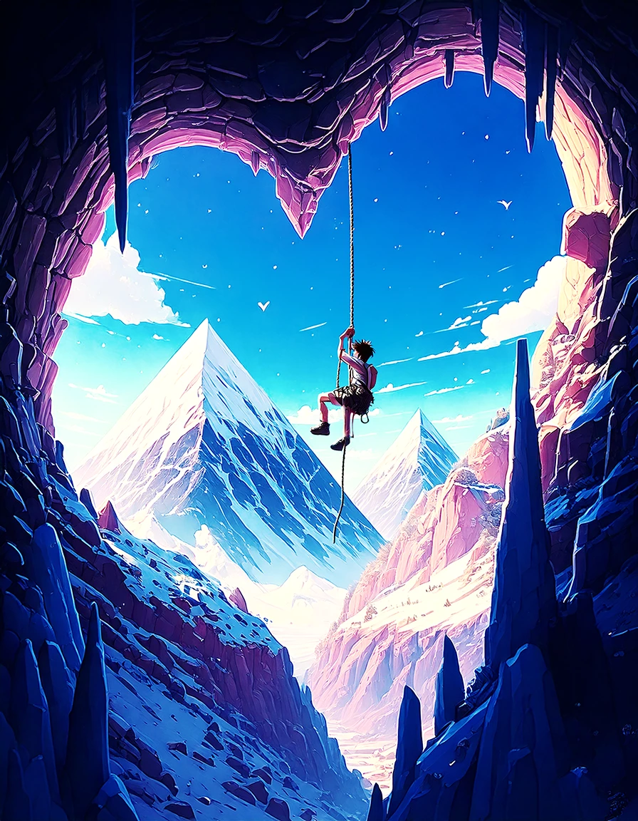 Prompt used: a young boy climbing a rope suspended from a heart-shaped cave opening. A landscape of snow-capped rocky mountains under a blue sky with light white clouds can be seen in the background.