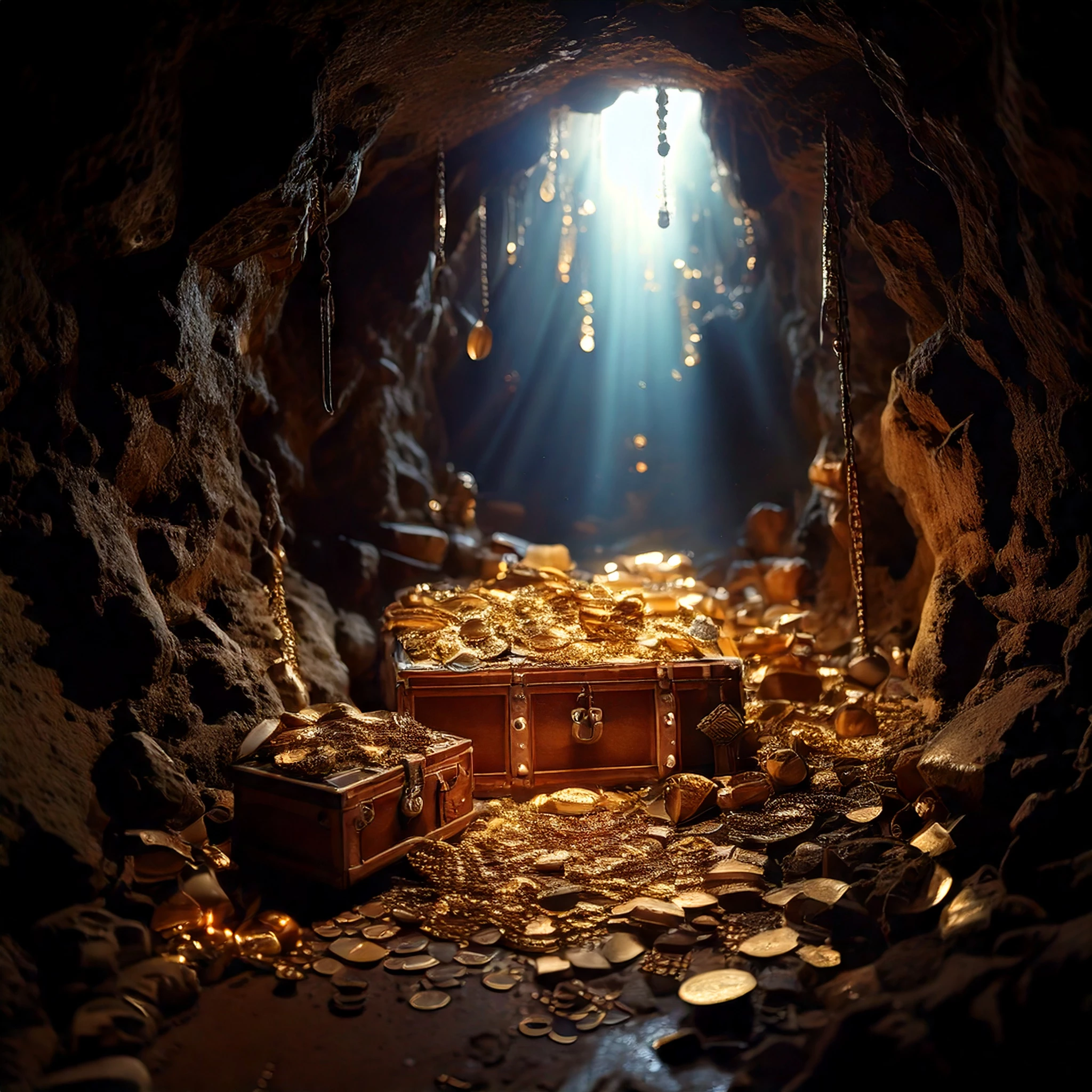 A dark pirate cave fully stocked with shiny treasure