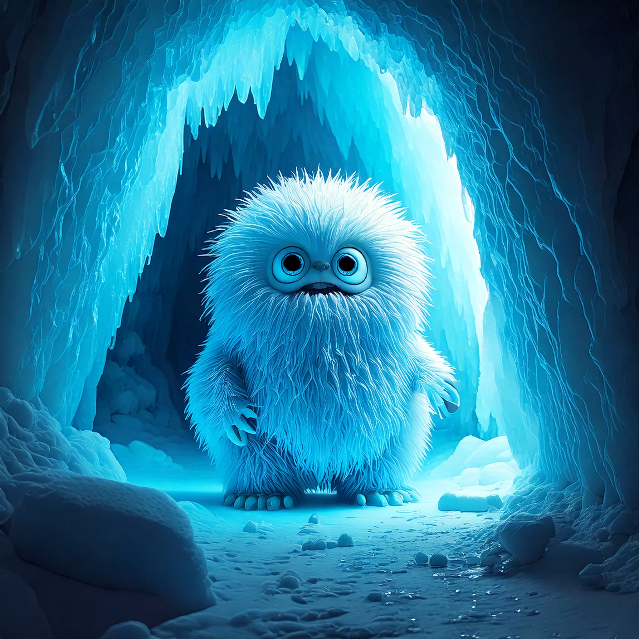 an ice cave shining with blue light and a furry white friendly monster inside