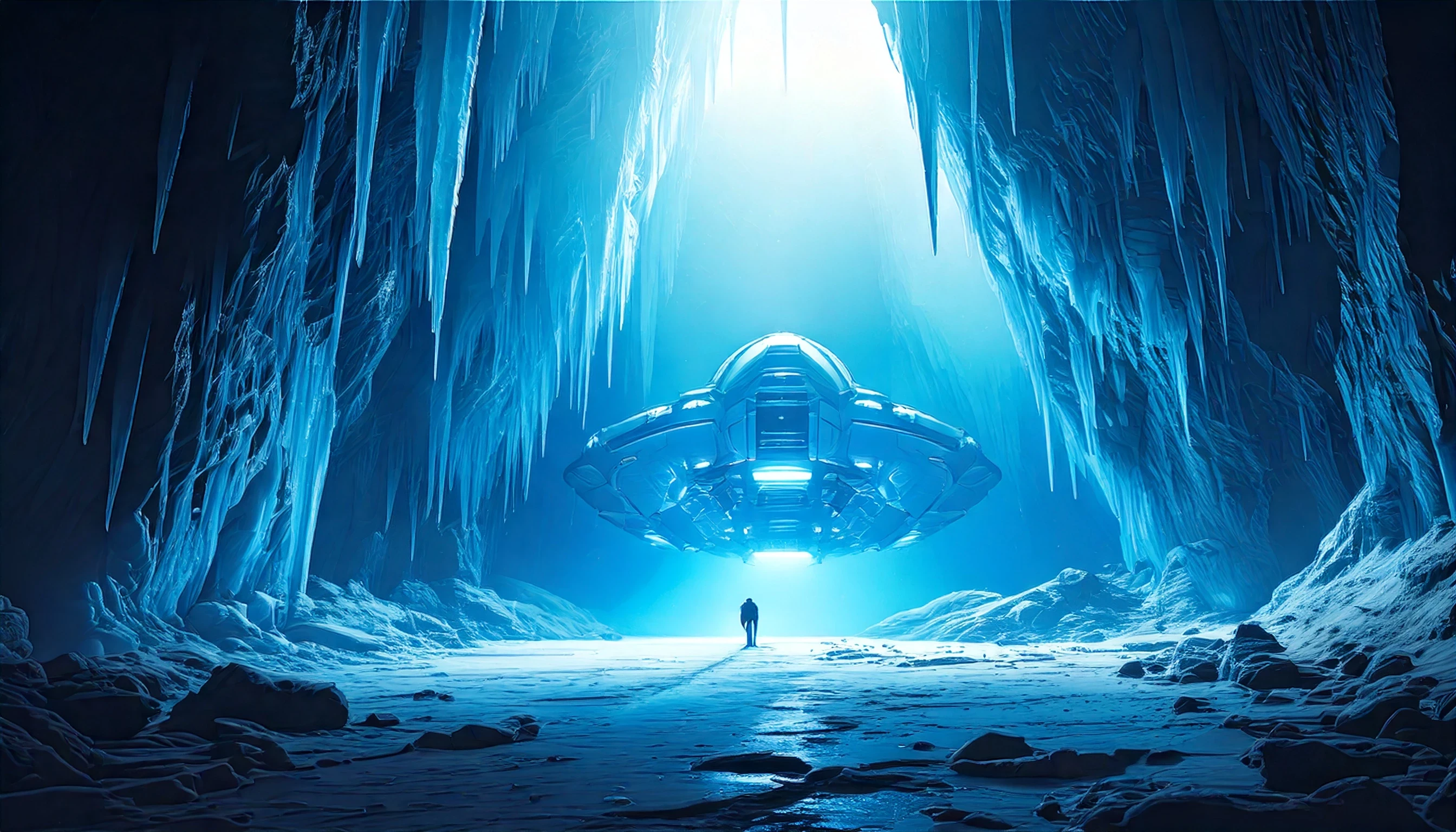 Prompt: large ice cave interior, futuristic spaceship frozen in the ice. hitech technology with glowing blue neons lights, dramatic scene, ice fog, movie poster style.