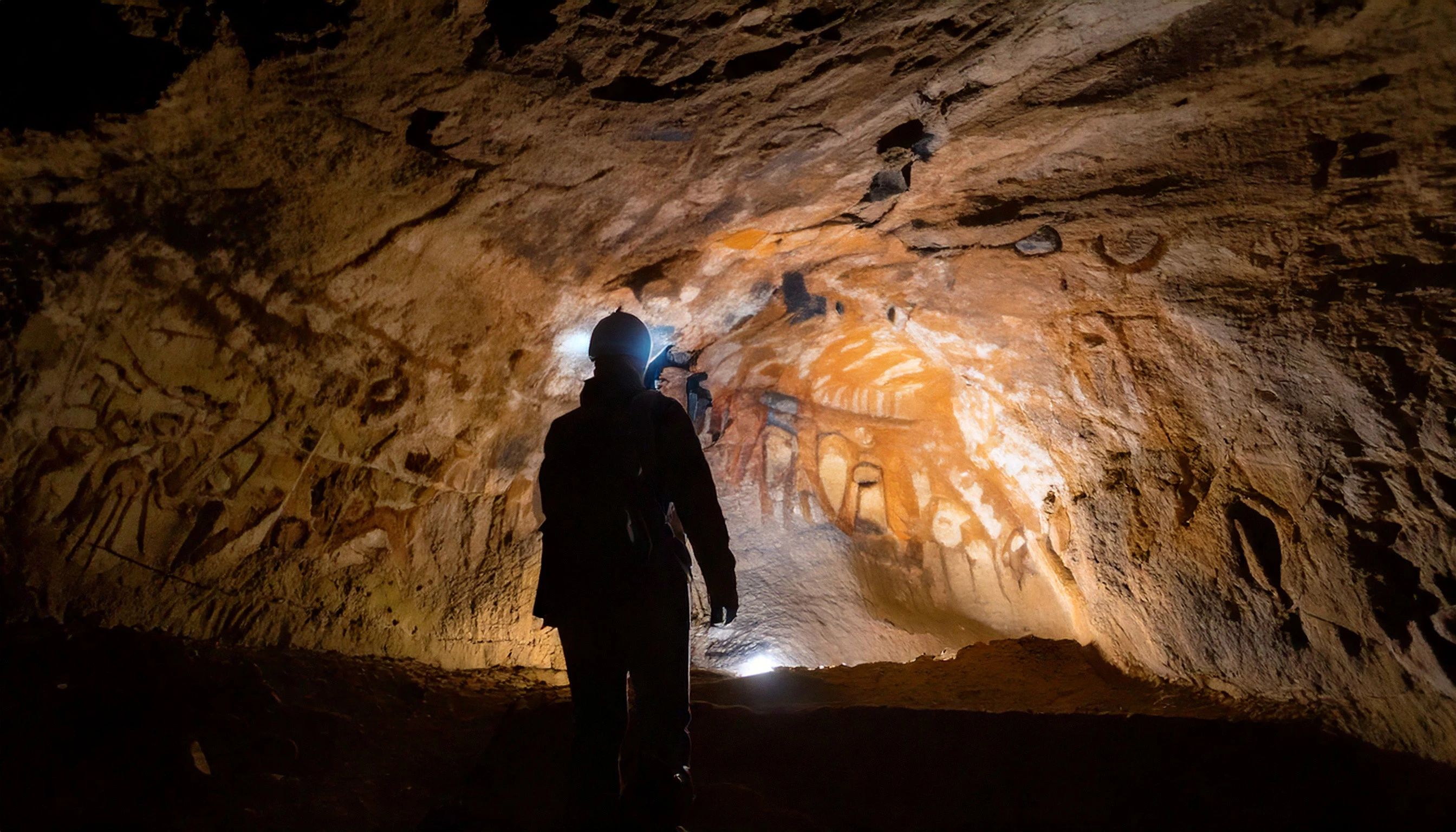 Un spéléologue vu de dos, avec une lampe frontale éclairant la paroi d'une grotte contenant des peintures rupestres préhistoriques