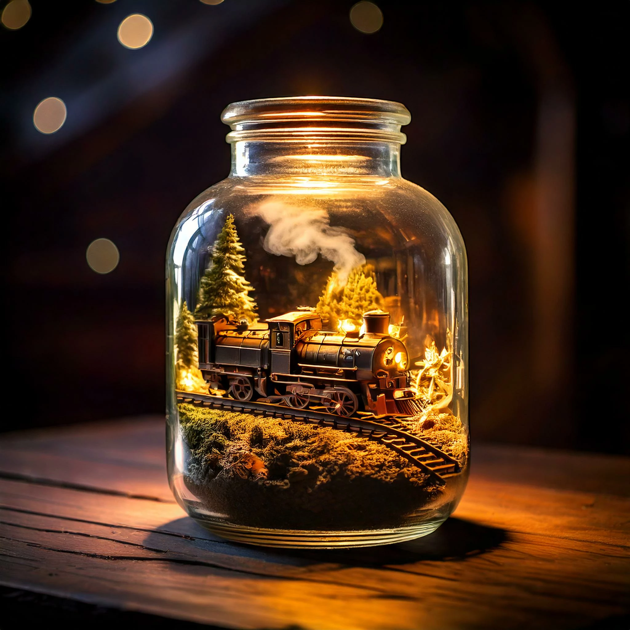 a tiny steam train engine on a circle train track around a little mountain inside a magically illuminated glass jar. It is standing on a dusty board in an old trainshed