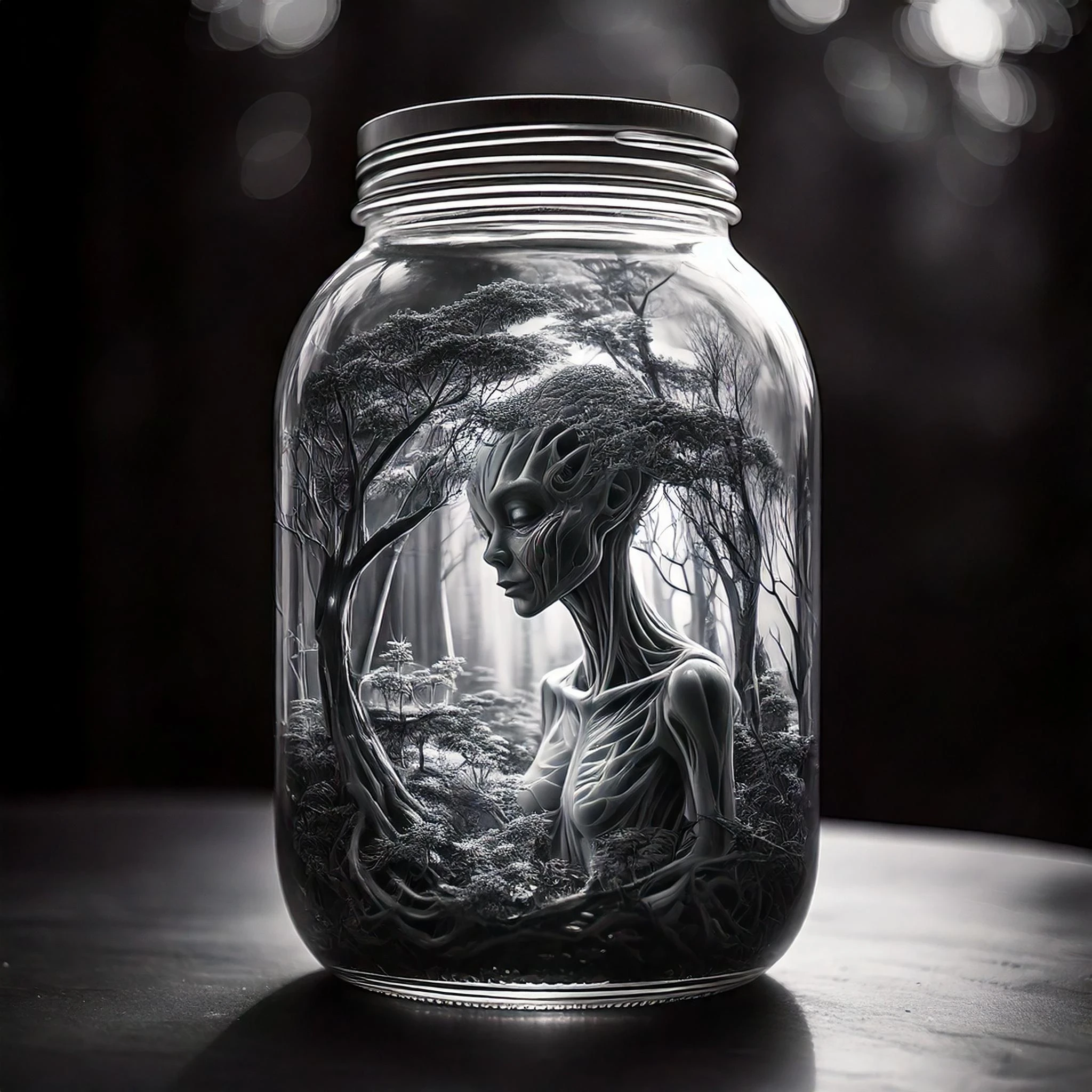 Prompt: an alien beauty in a jar with nature and trees, b&w