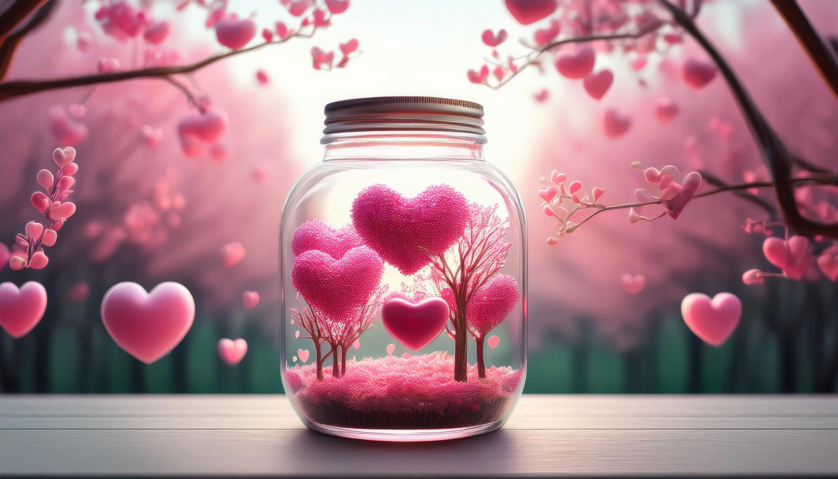 Prompt: Love forest in a jar, pink heart shaped trees with bushes adorned with heart berries.