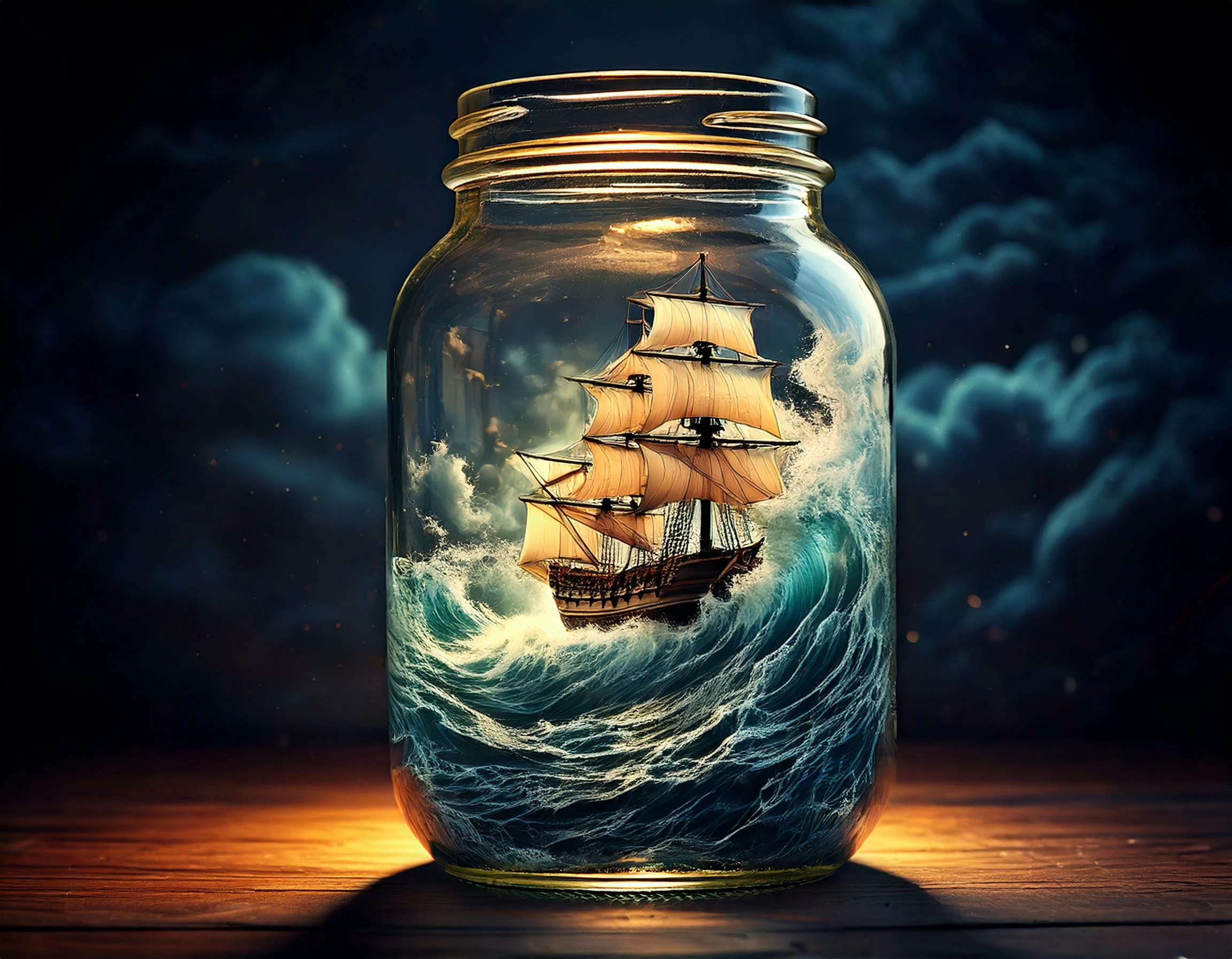 Prompt: Storm in a jar, ship riding giant waves
