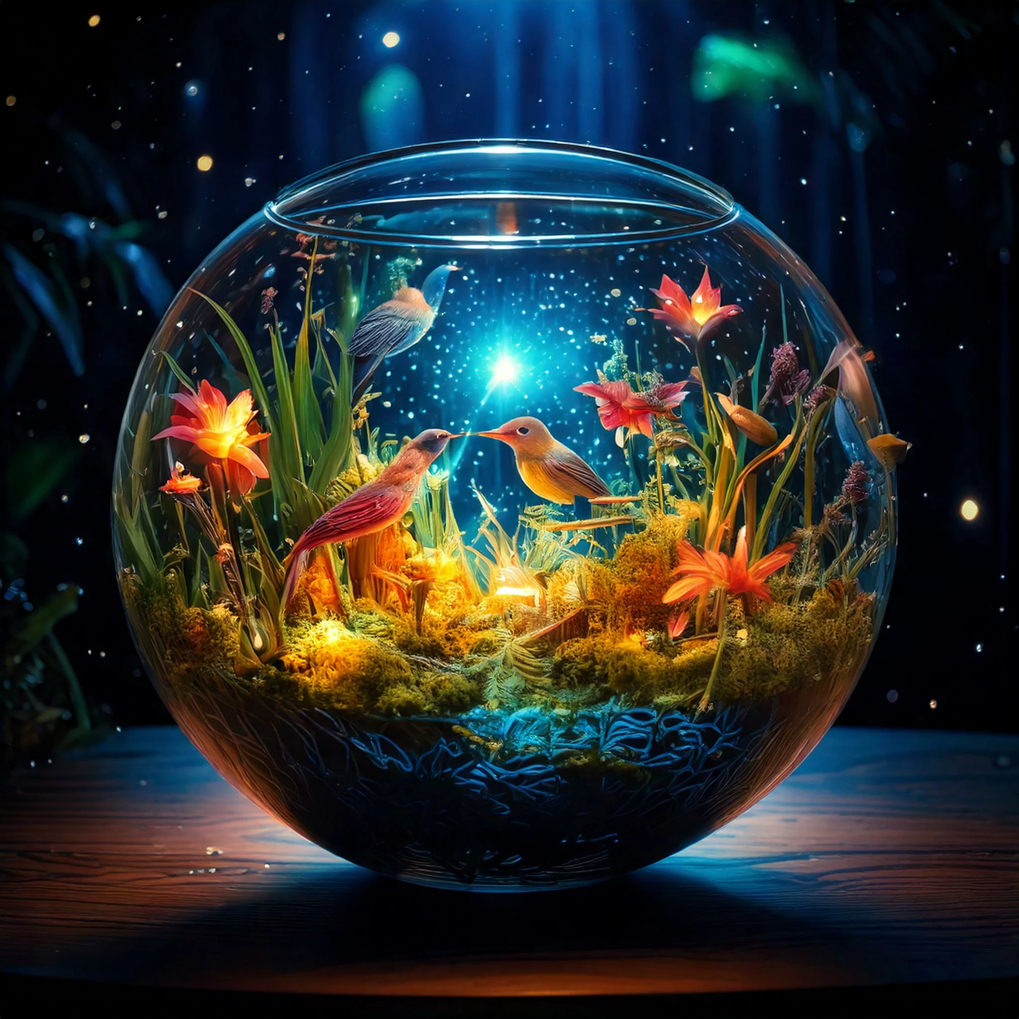 Prompt: a beautiful shiny crystal glass containing a colorful phoenix that rises from fire and ashes.