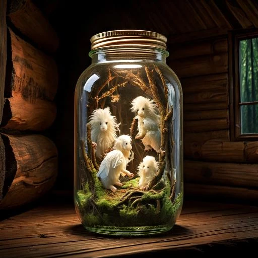 "Faires trapped in a mason jar inside a log cabin"