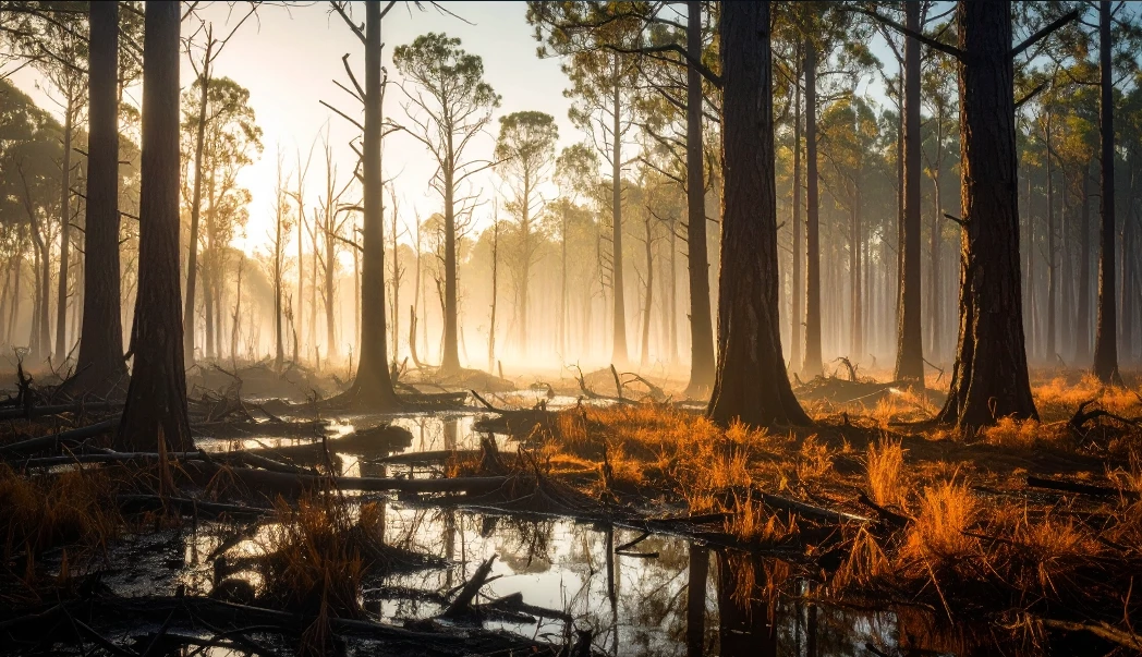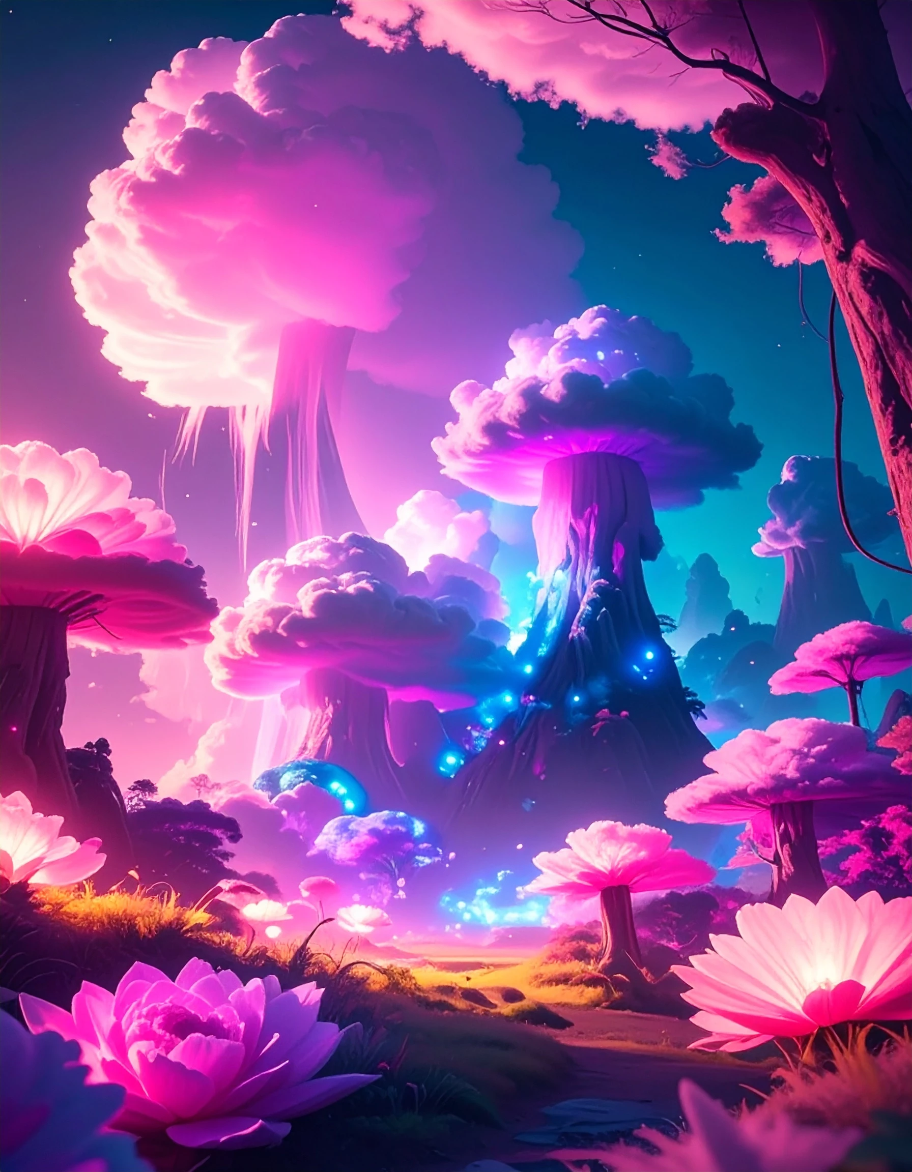 Prompt: create a Magical Forest from 250 years from now, inhabited by global temperatures, more extreme weather events, substantial sea-level rise (altering coastlines and displacing populations), widespread desertification, and dramatic shifts in ecosystems and biodiversity.