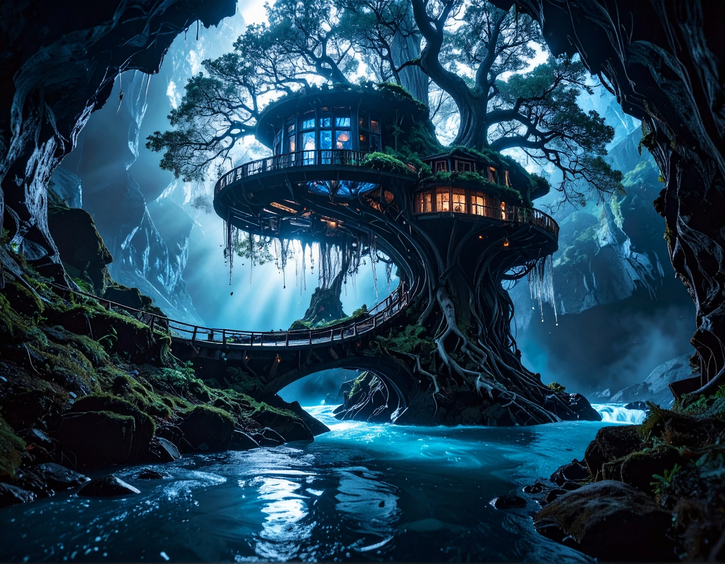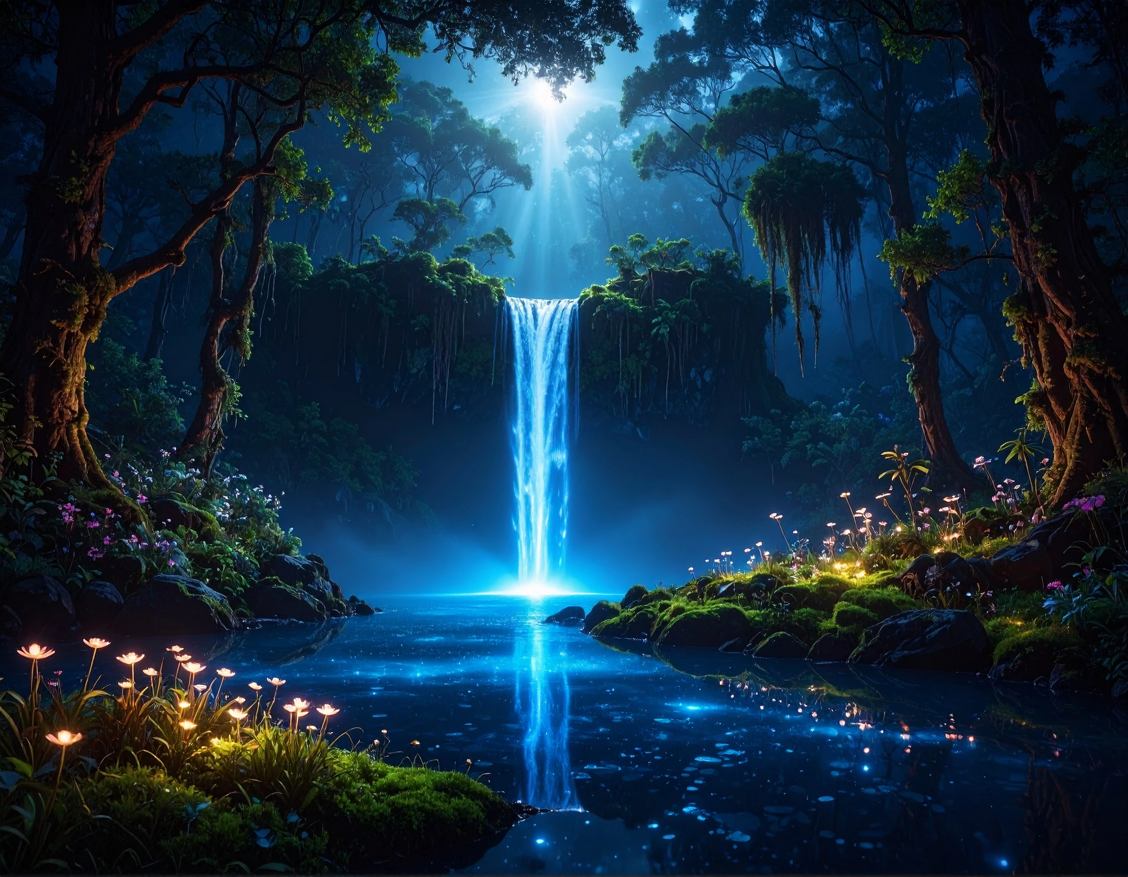 a small glowing waterfall hidden deep in a dark dense magical tropical rain forest, a ruin of an ancient building overgrown with moss and plants, lots of large tropical trees; tiny flowers and glowing mushrooms on a mossy floor, magical atmosphere; mysterious scene