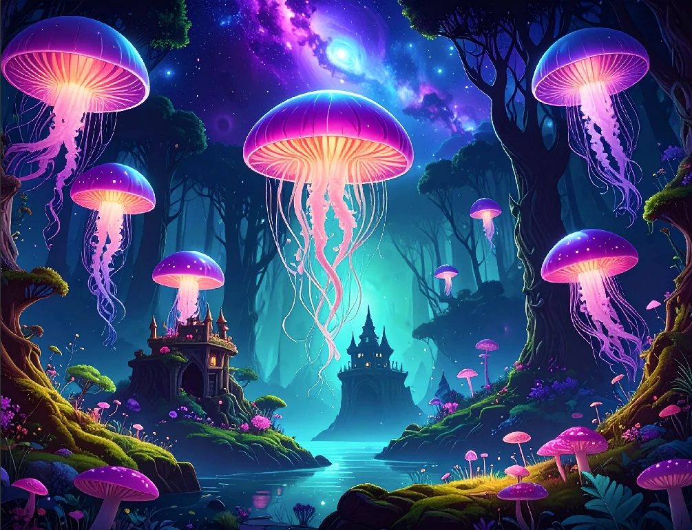 fantasy mystical forest, with jelly fish, with a elvish fort, inter galactic space background