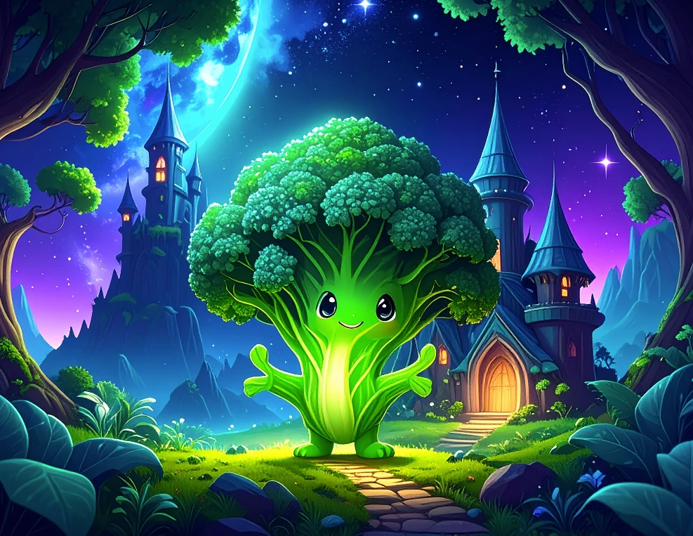cartoon kale character, in fantasy mystical forest, with a elvish fort, inter galactic space background
