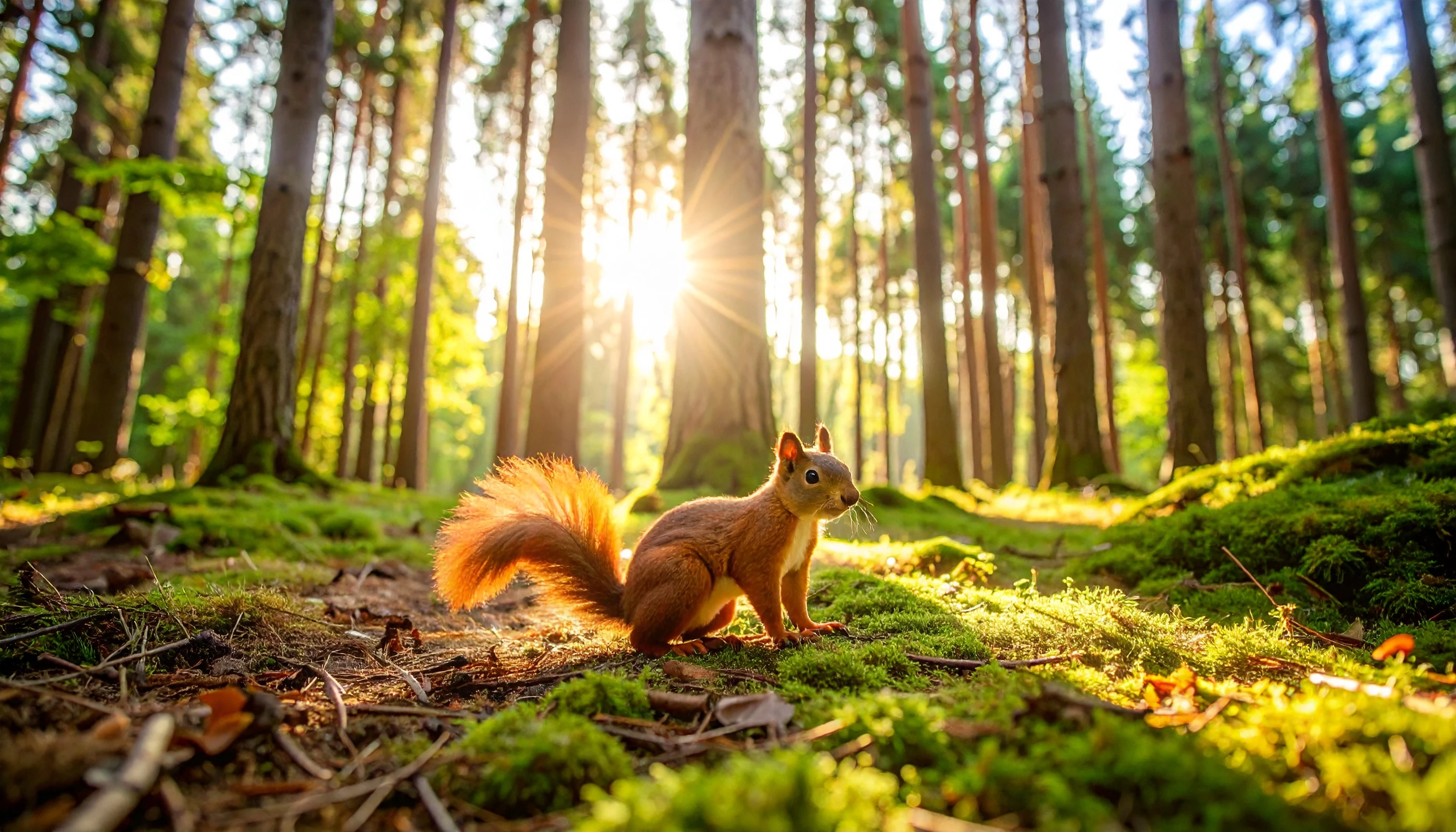 Prompt: A squirrel on the ground in at the middle of a forest with rays of sunlight streaming through the trees, warm summer light, wide angle view