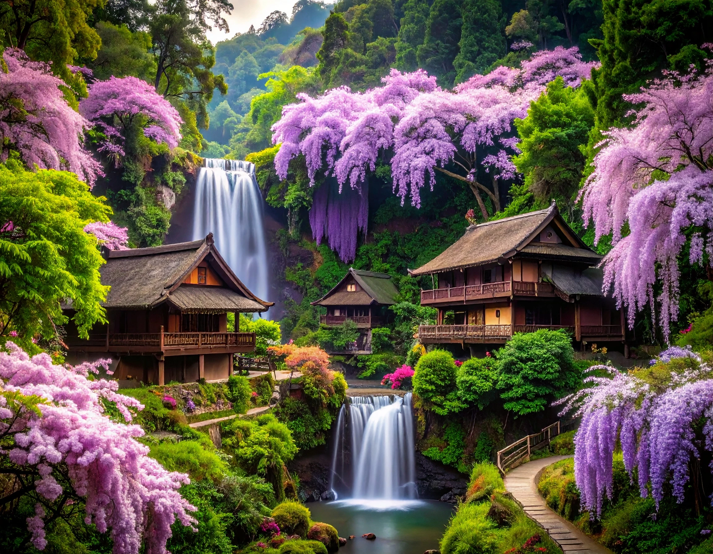 Prompt: densely wooded magical forest filled with pink cherry blossom sakura trees and giant purple wisteria surrounding a small village of rustic, wooden houses suspended in the trees deep in a jungle behind a waterfall