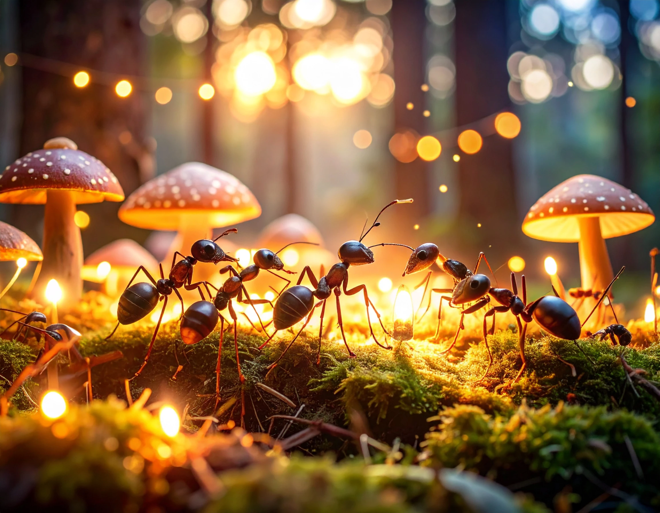 Whimsical digital artwork of an ant party in a magical forest. Tiny ants are celebrating with miniature decorations, glowing lanterns, and tiny food in a forest clearing filled with bioluminescent plants, glowing mushrooms, and fireflies. The atmosphere is enchanted and joyful, with rich colors, soft lighting, and playful fantasy details throughout the scene.