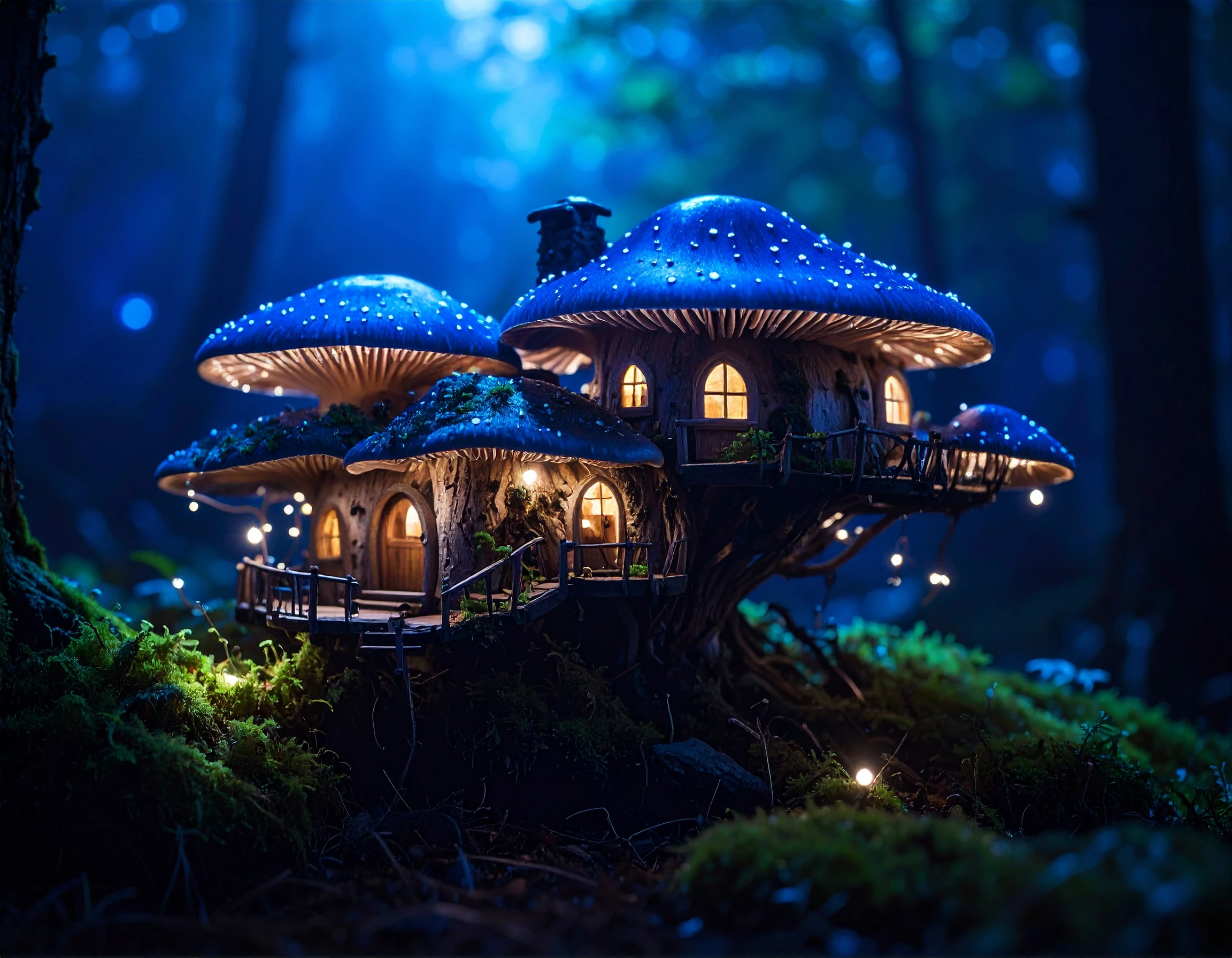 Prompt: fantasy village in a magical forest, with several treehouses built high in the trees connected by wooden bridges. Small magical creatures scattered throughout the scene, the environment lit with soft and warm lights, lush vegetation with moss, rocks and ferns, a realistic forest background and sunlight filtering through the trees."