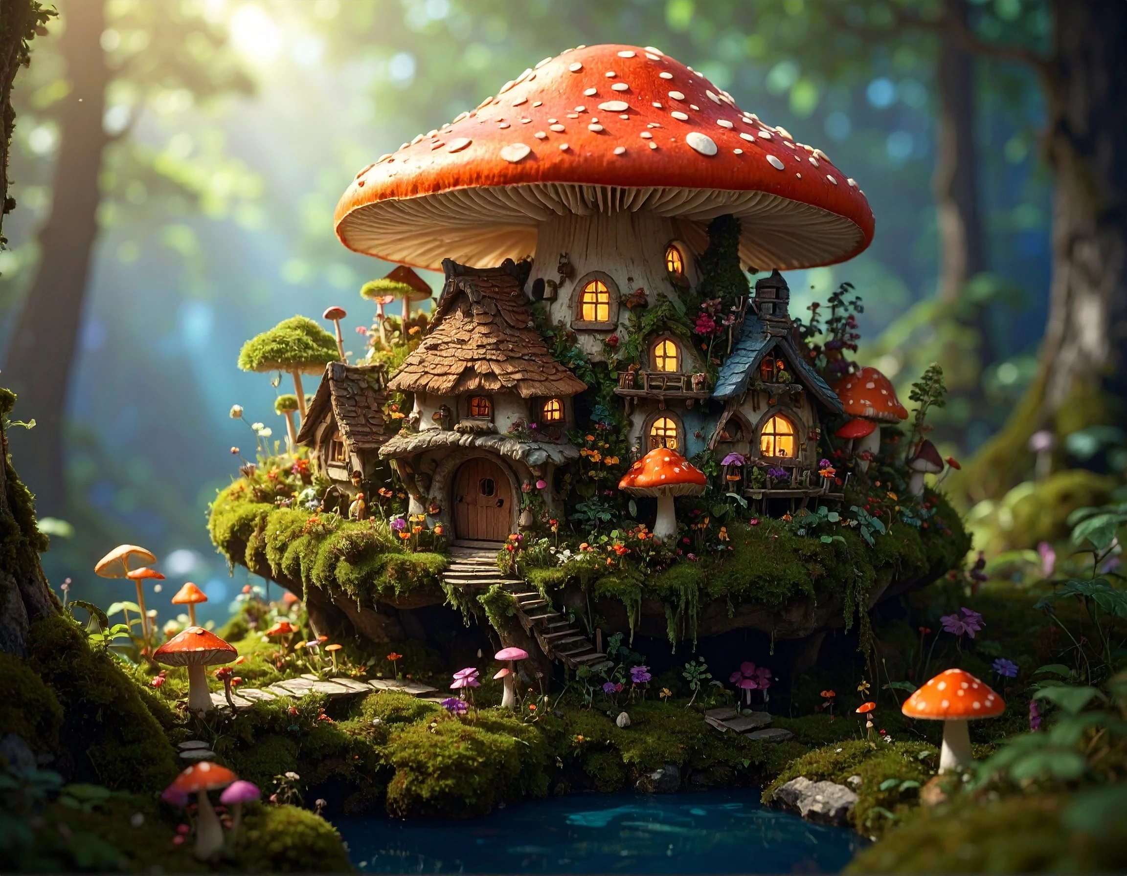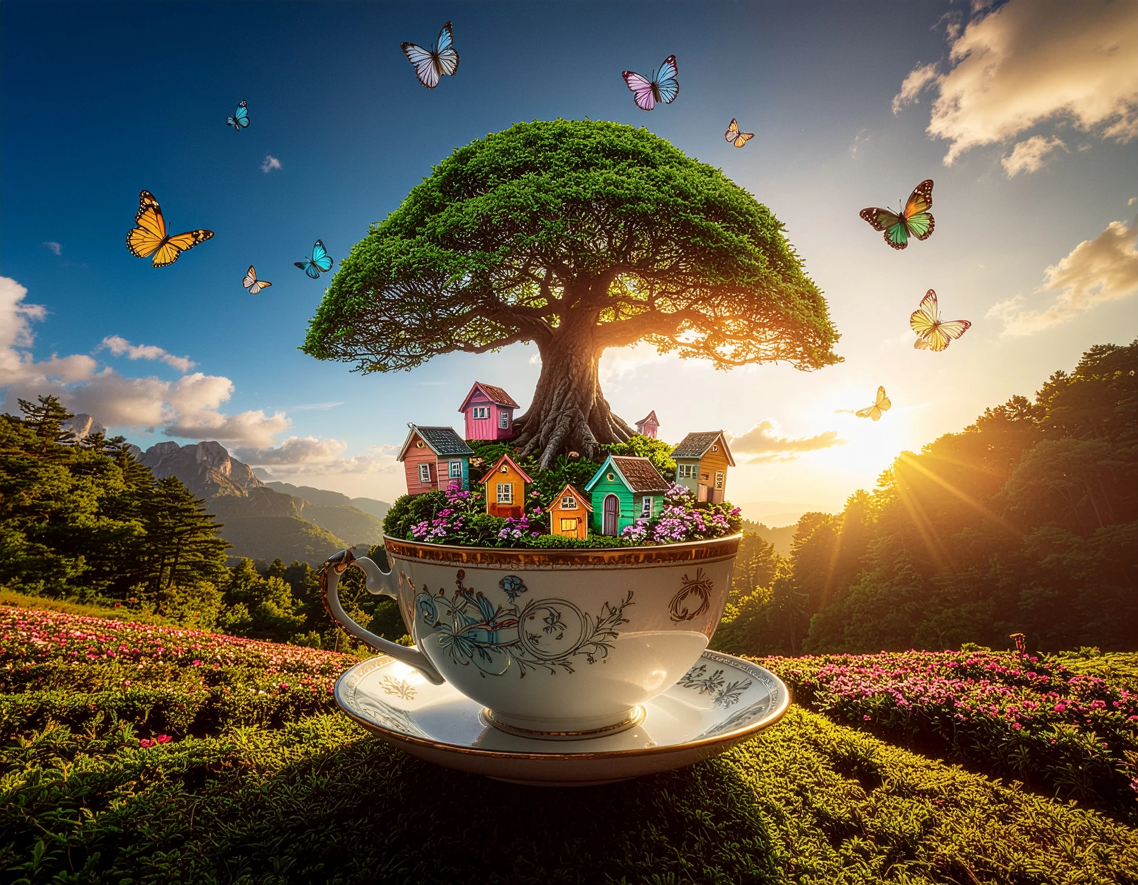 The Prompt I used: A whimsical miniature world inside a vintage teacup on a wooden table — featuring a lush forest, mushroom houses, a waterfall, and tiny people picnicking. Soft, warm lighting, macro style, with delicate textures and a blurred background for depth.