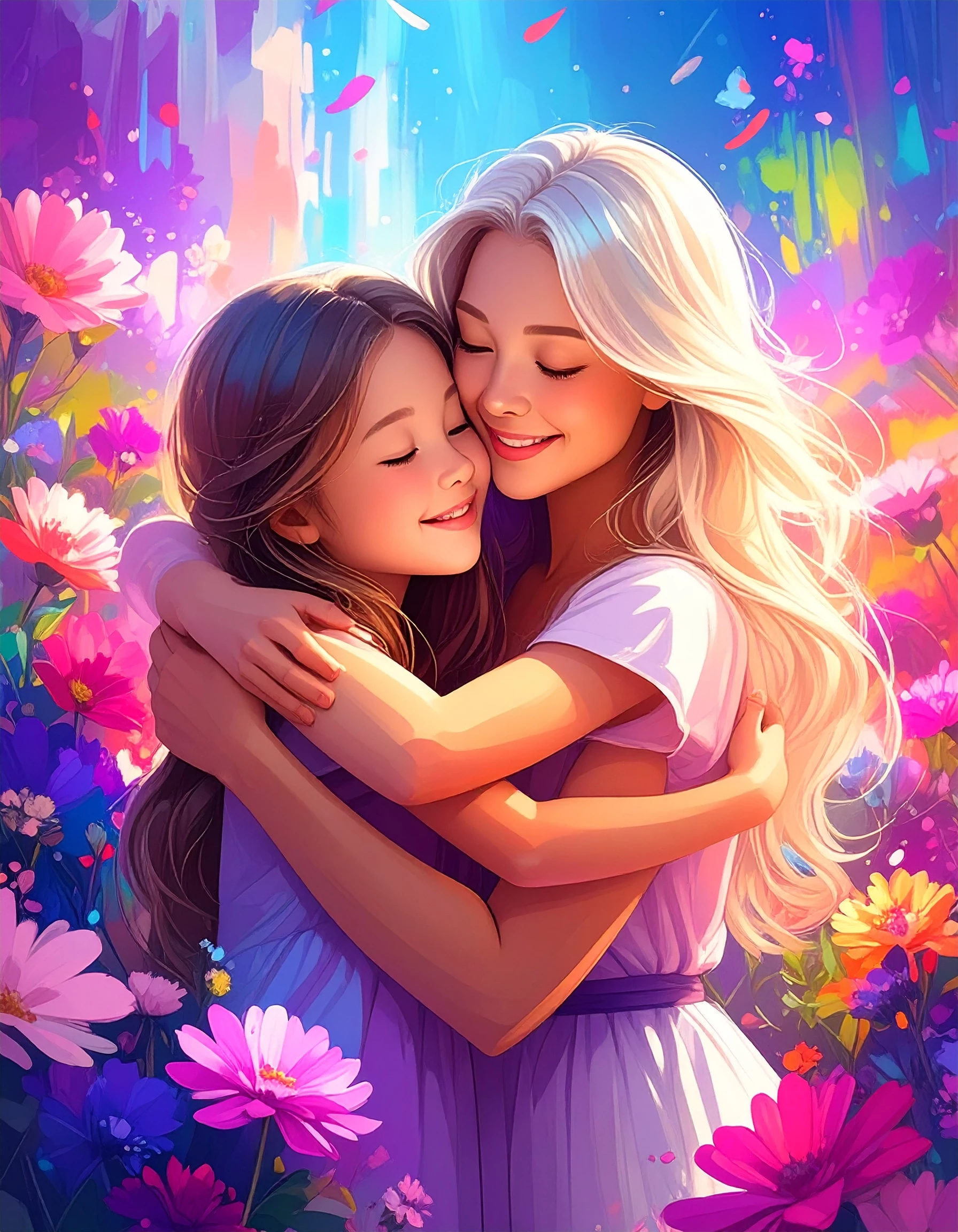Prompt: A mother and daughter hugging tenderly in a bright, modern setting. They are surrounded by flowers in shades of pink and purple. Both are smiling warmly, with a soft, colorful background. Digital illustration, clean style, well-lit and emotional