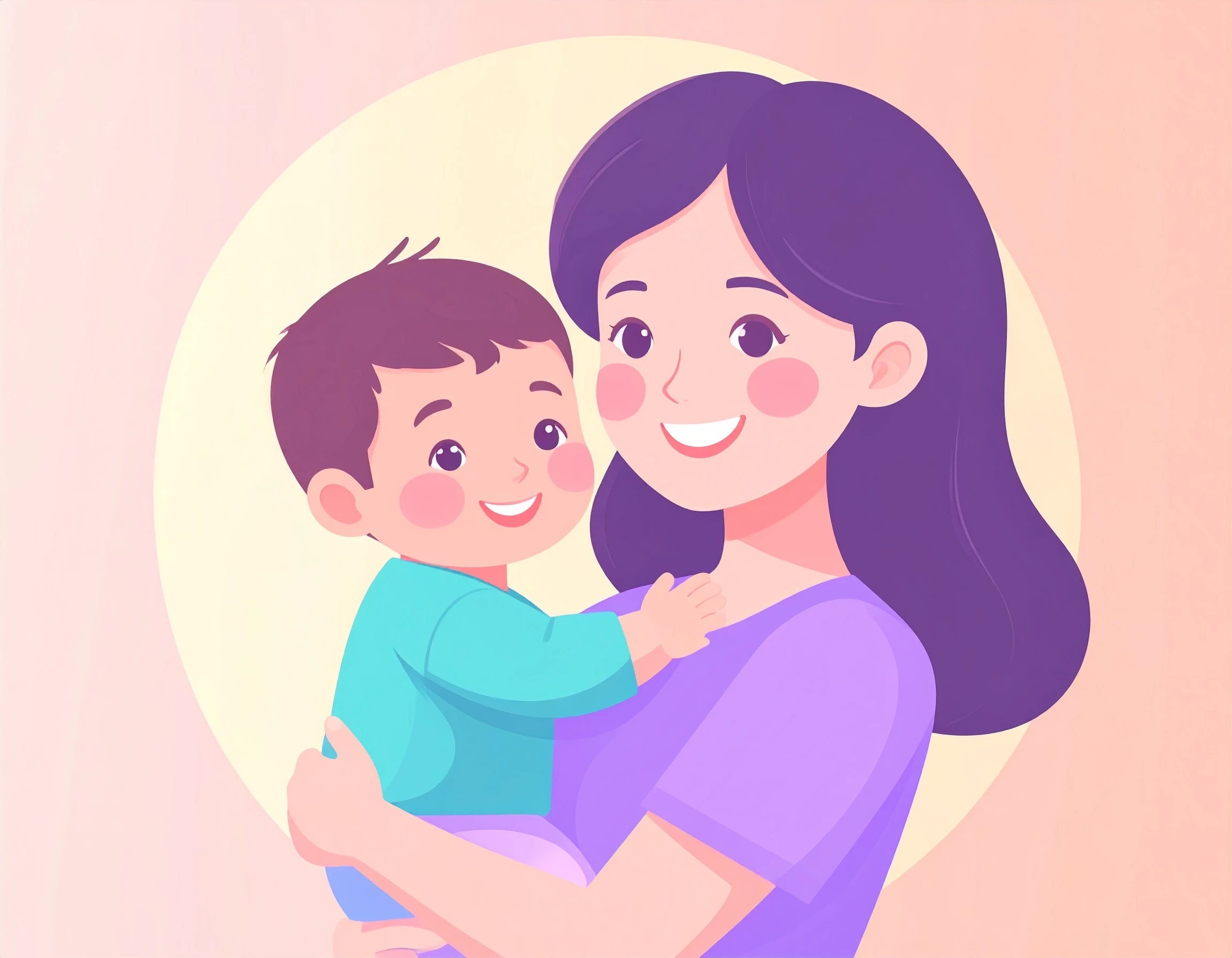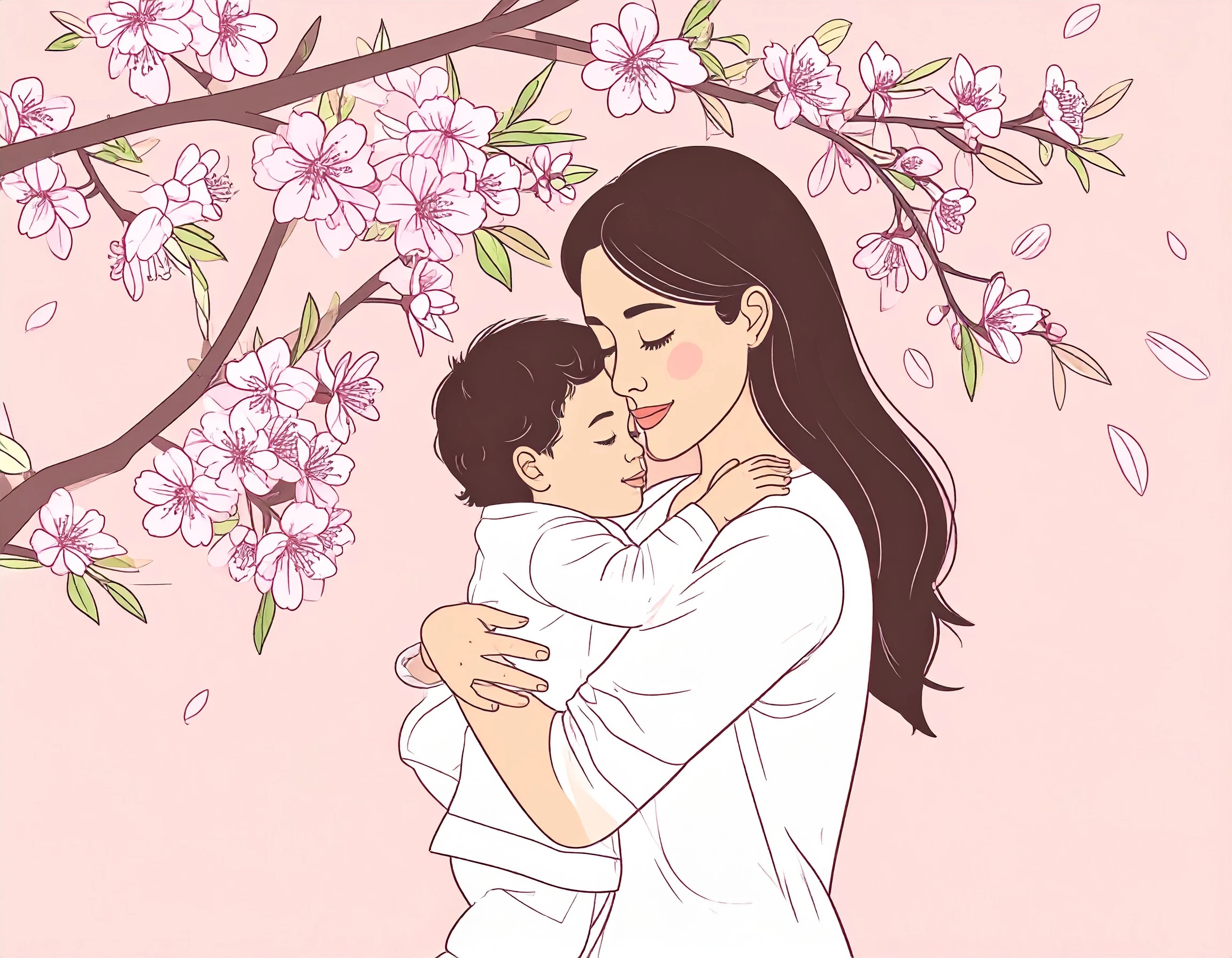 Prompt used : A gentle illustration of a mother hugging her child under a blooming cherry blossom tree, with soft, pastel colors and delicate line art.