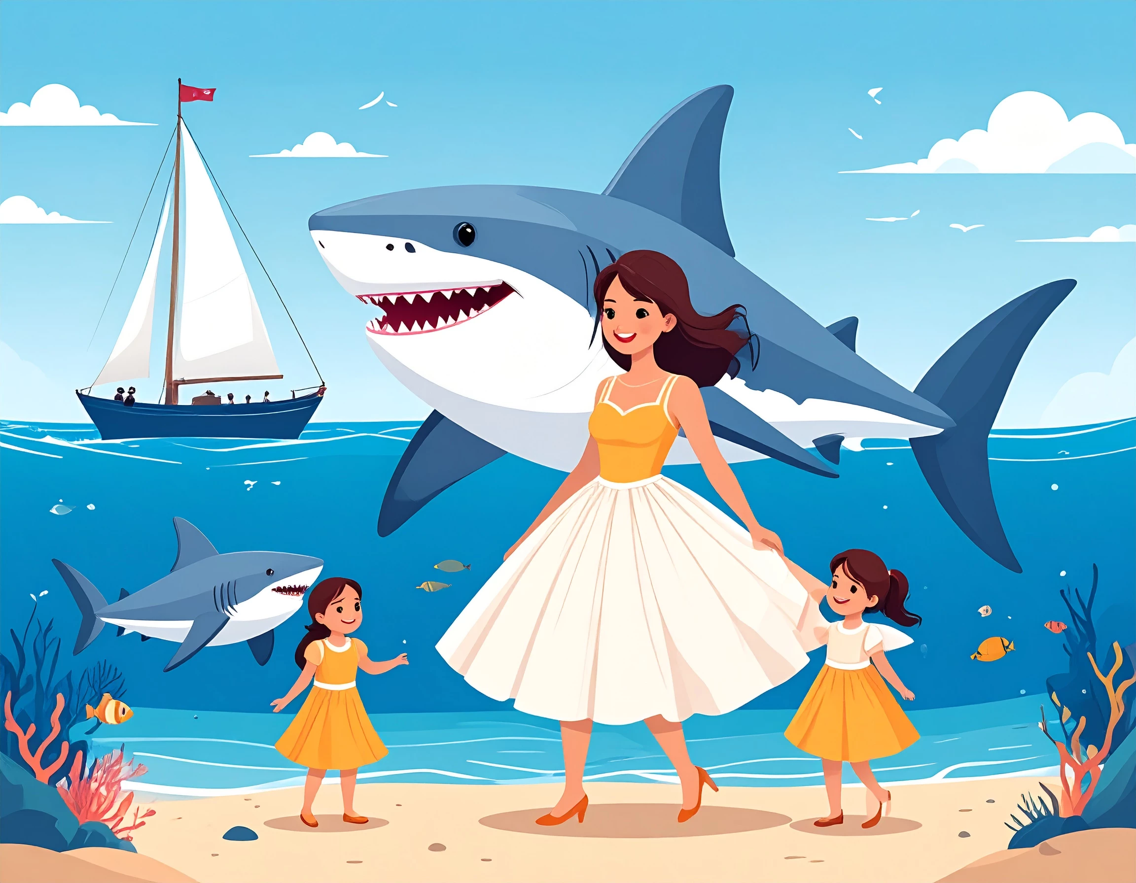 Prompt: Clean vector art of a shark wearing a dress and protecting her baby sharks from human fishing boats.