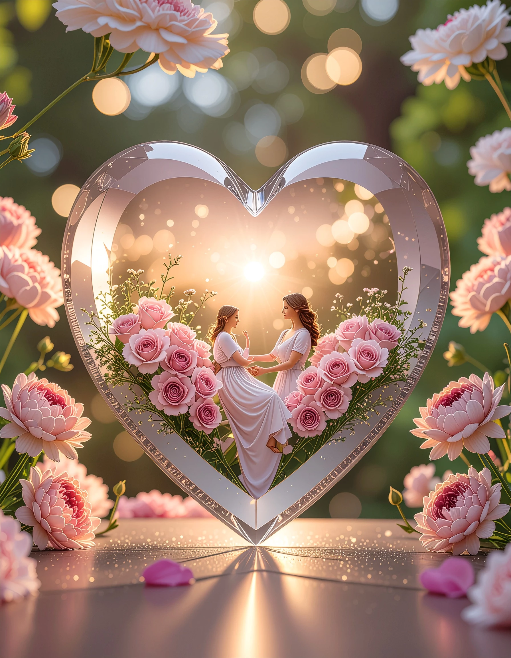 Prompt: A glass heart filled with a beautiful image of motherhood, surrounded by a beautiful carnation display, a light bokeh effect streams the background