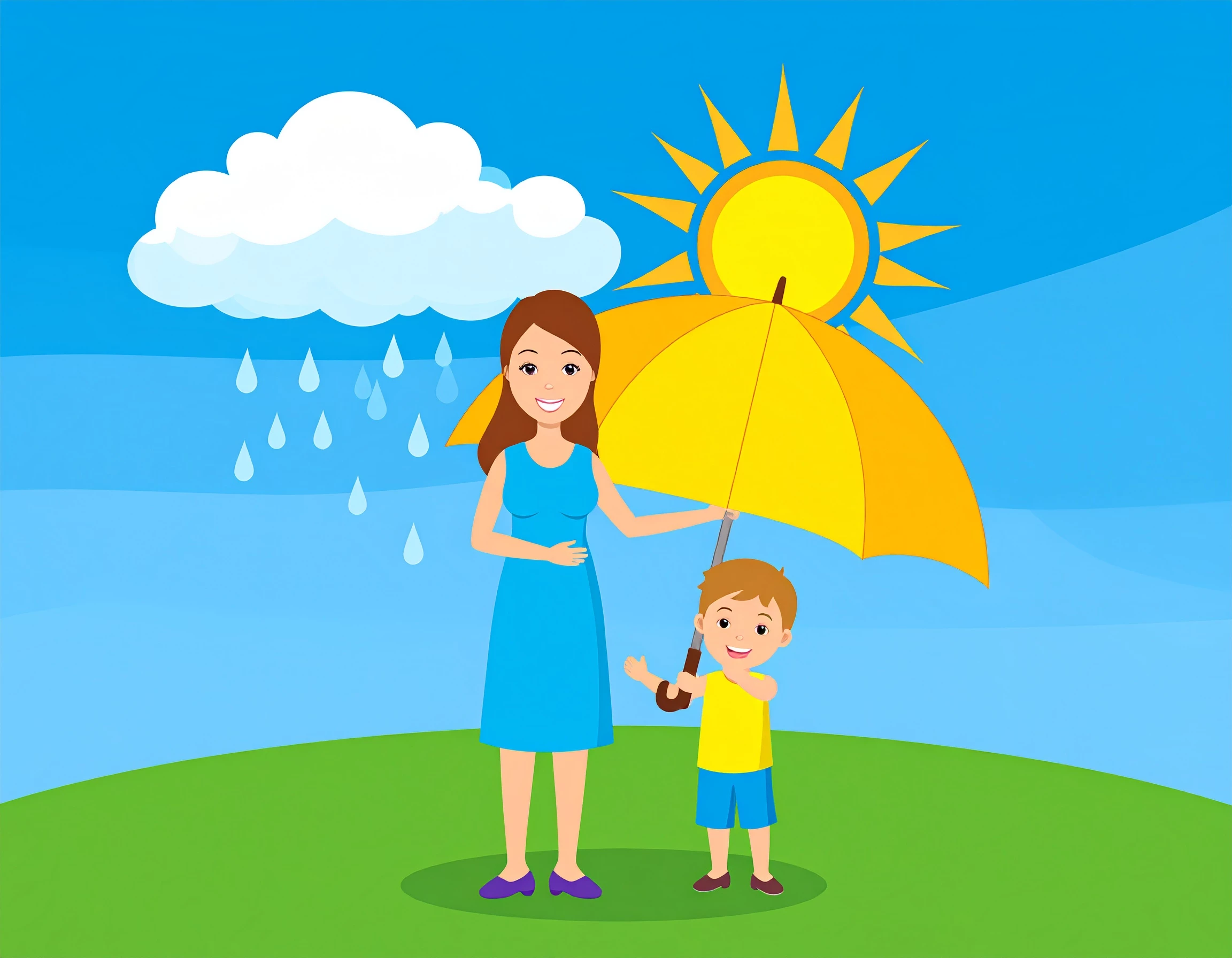Prompt: A cartoon of a mother shielding the child from dark clouds and only letting the sun in