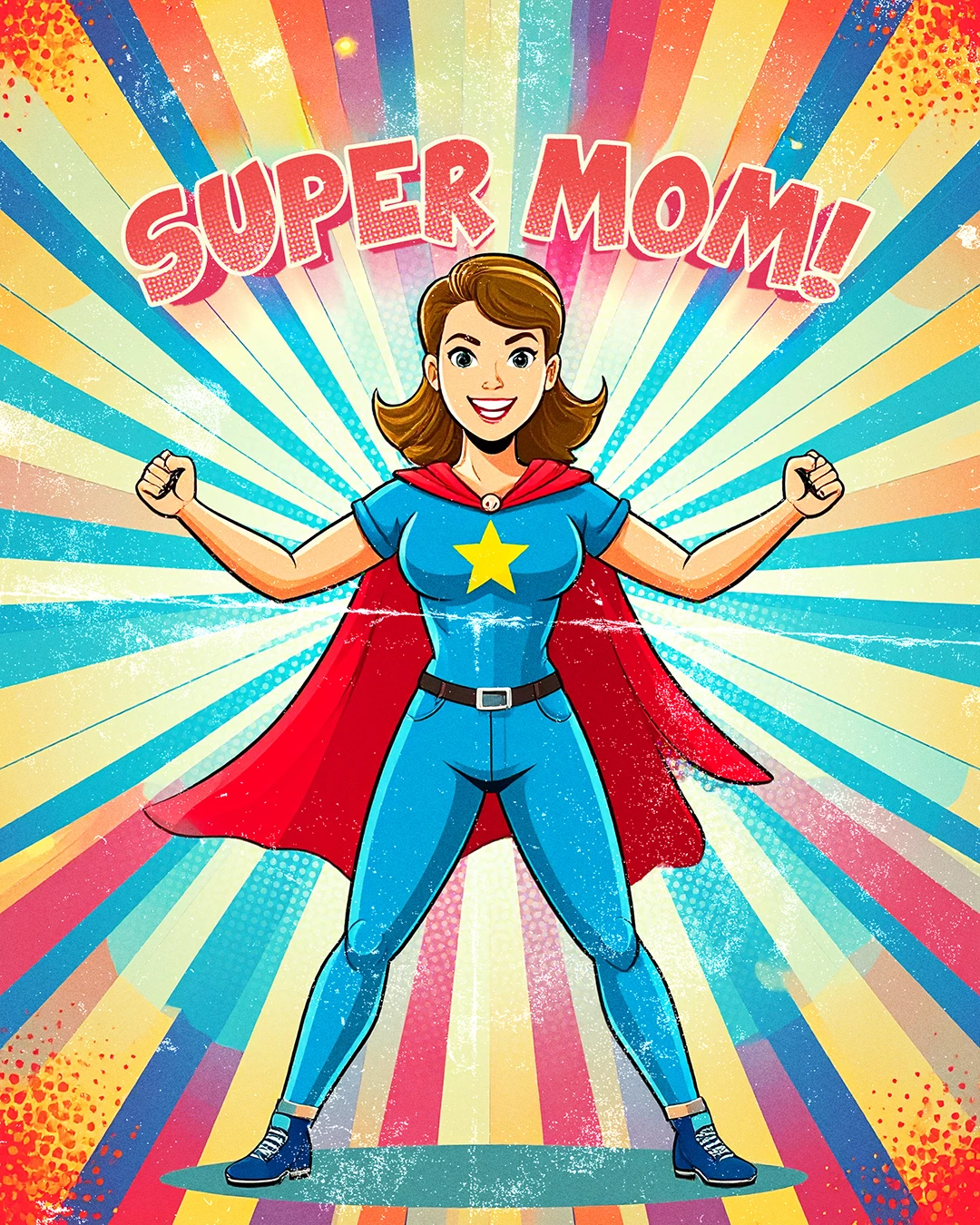 Prompt:comics style super mom poster. A woman in a heroic pose, burst and halftone background