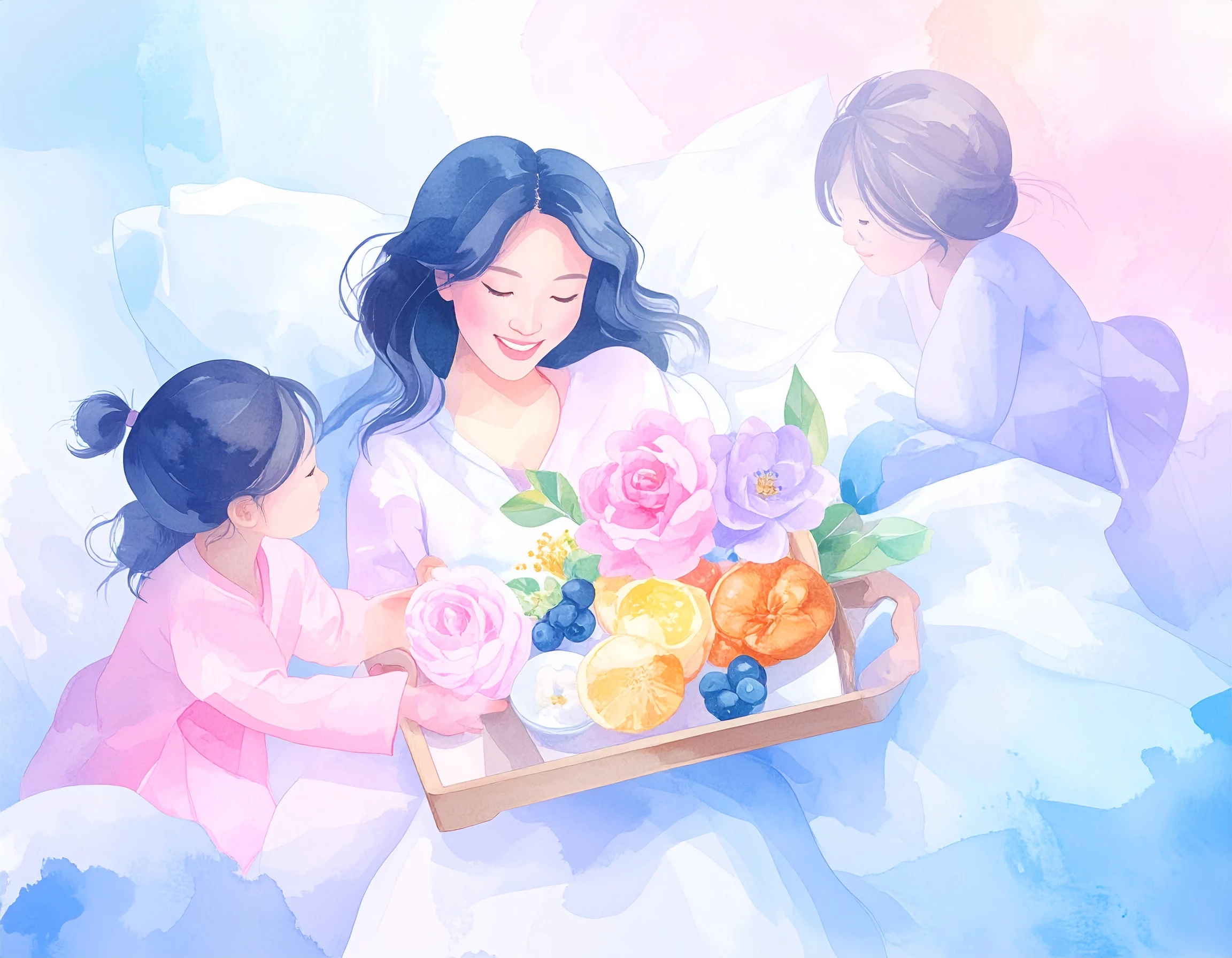 Prompt: Mother in bed being served breakfast on a tray by her two daughters. Photorealistic. Soft lighting.