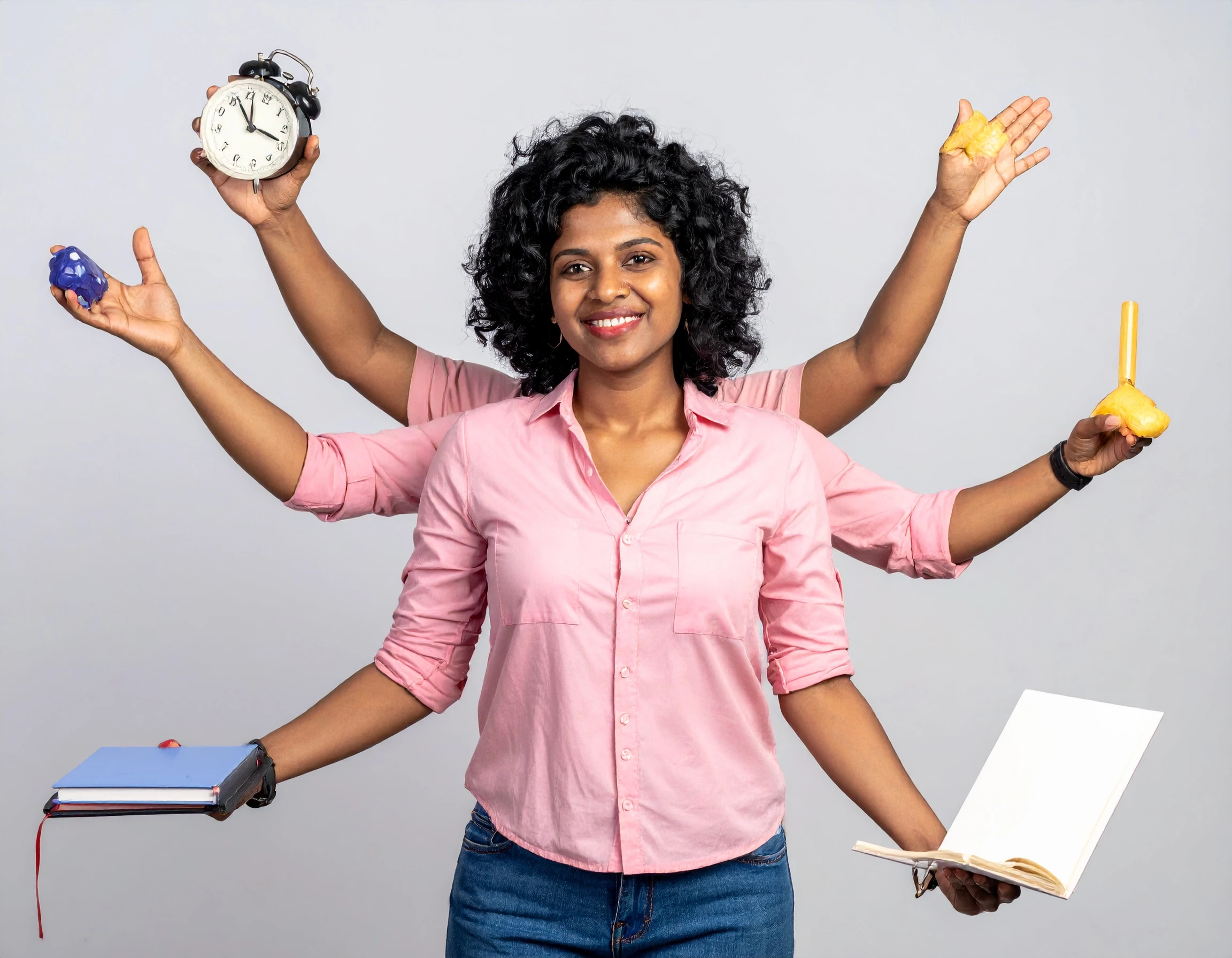 mom with mulitple hands, balancing her job as a teacher in middle school, house chores, kids, husband, as well as her own personal self care, each hand showing her doing one thing all at once, show all her duties, as mother, teacher, wife, daughter, sister etc as well in background