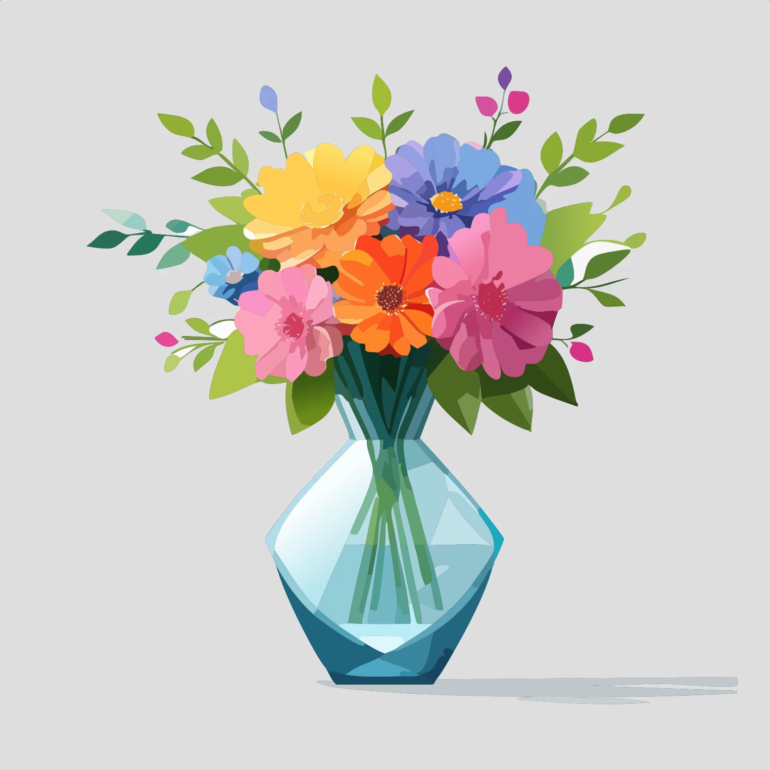 crystal vase with colorful flowers, clean vector, highly detailed, white background