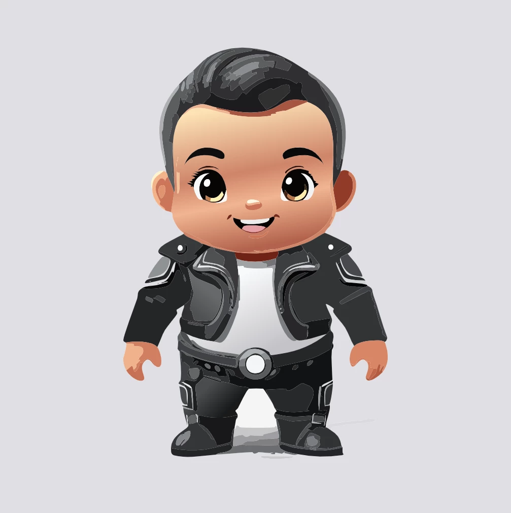 Highly detailed vector art of a man who looks like a chubby grumpy baby dressed in a black motorcycle outfit with an unzipped Motorcycle jacket.