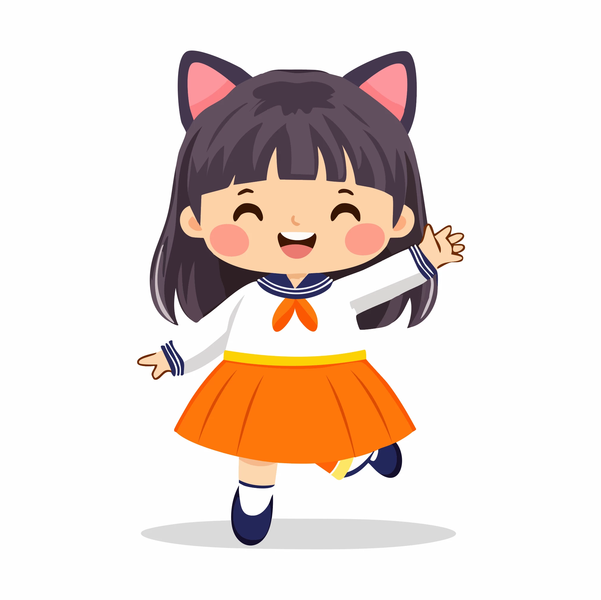 prompt : kawaii girl has cat nose and ears, wearing orange skirt, colorful flat cartoon, jumping and raise and waveing left hand, smiling.