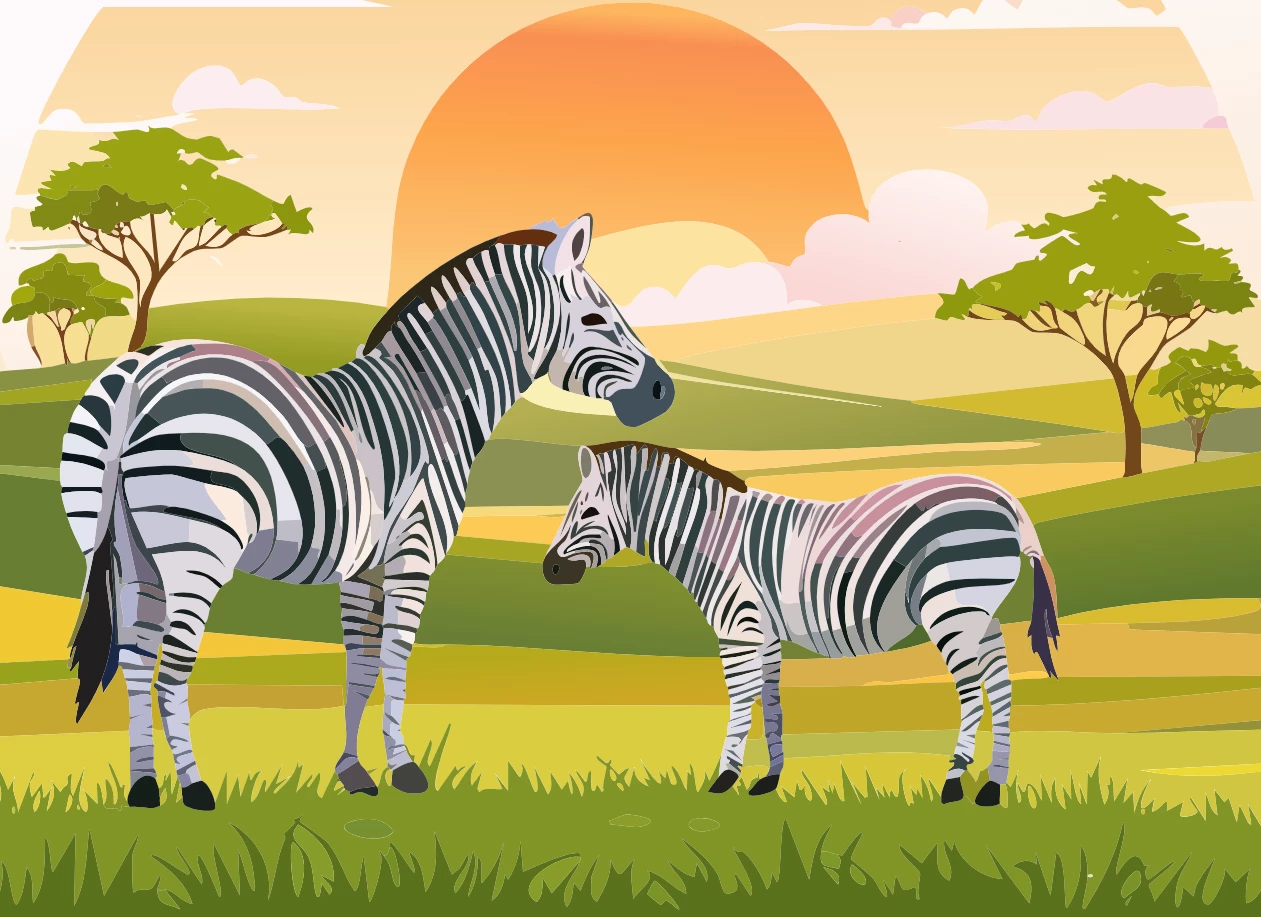 prompt: Zebras in a field in Africa with the sun rising in the distance