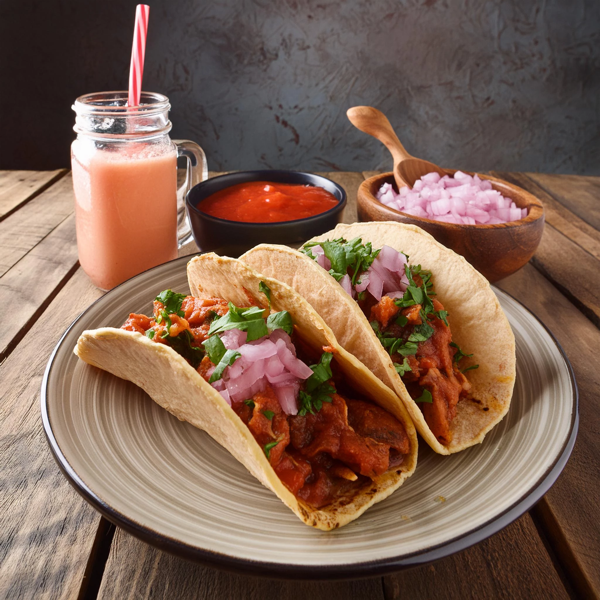 tacos al pastor with salsa red and horchata