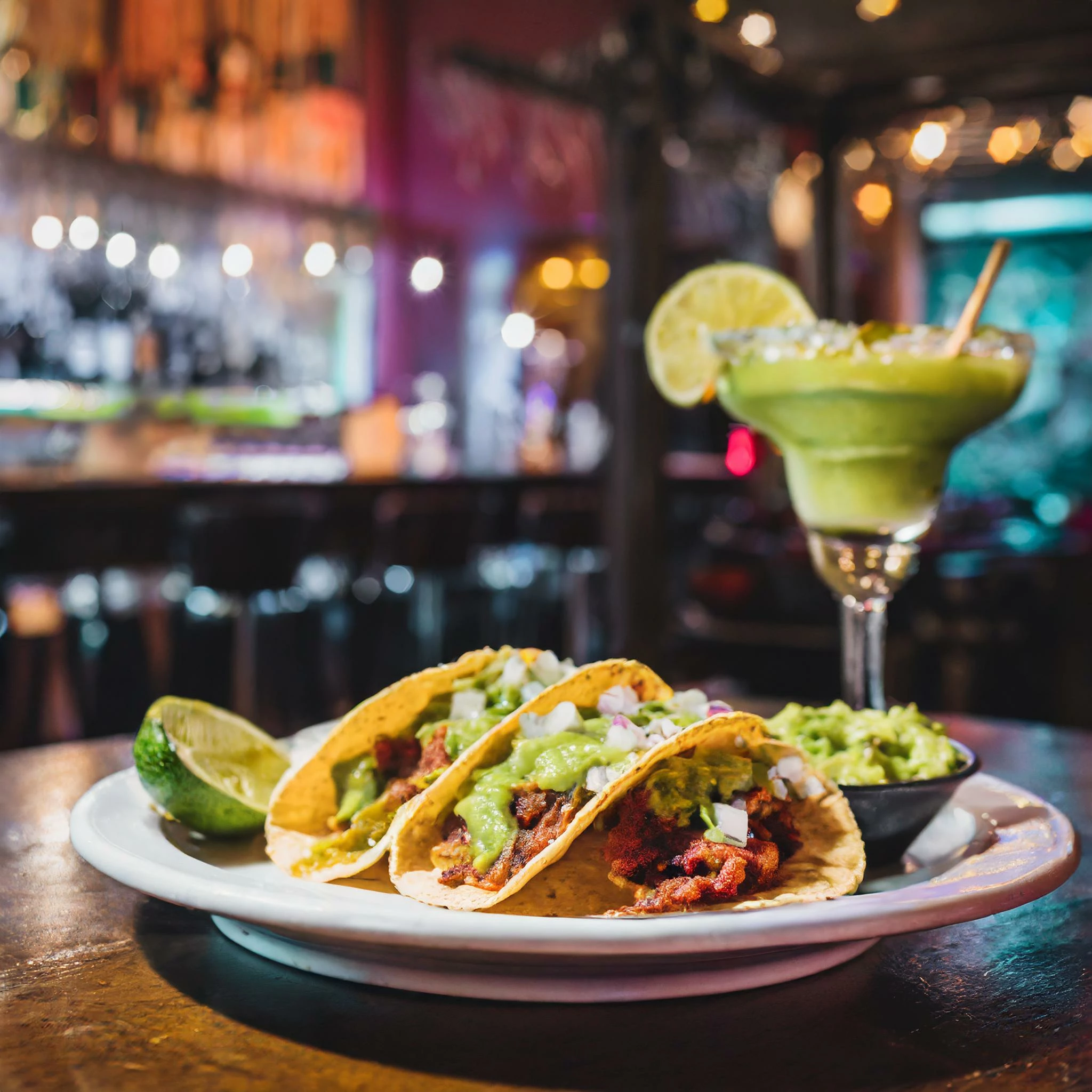 Prompt: from inside the booth of a moody bar you see a plate of tacos on the table with a side of guacamole and a salted margarita with a moody, colorful bar behind them