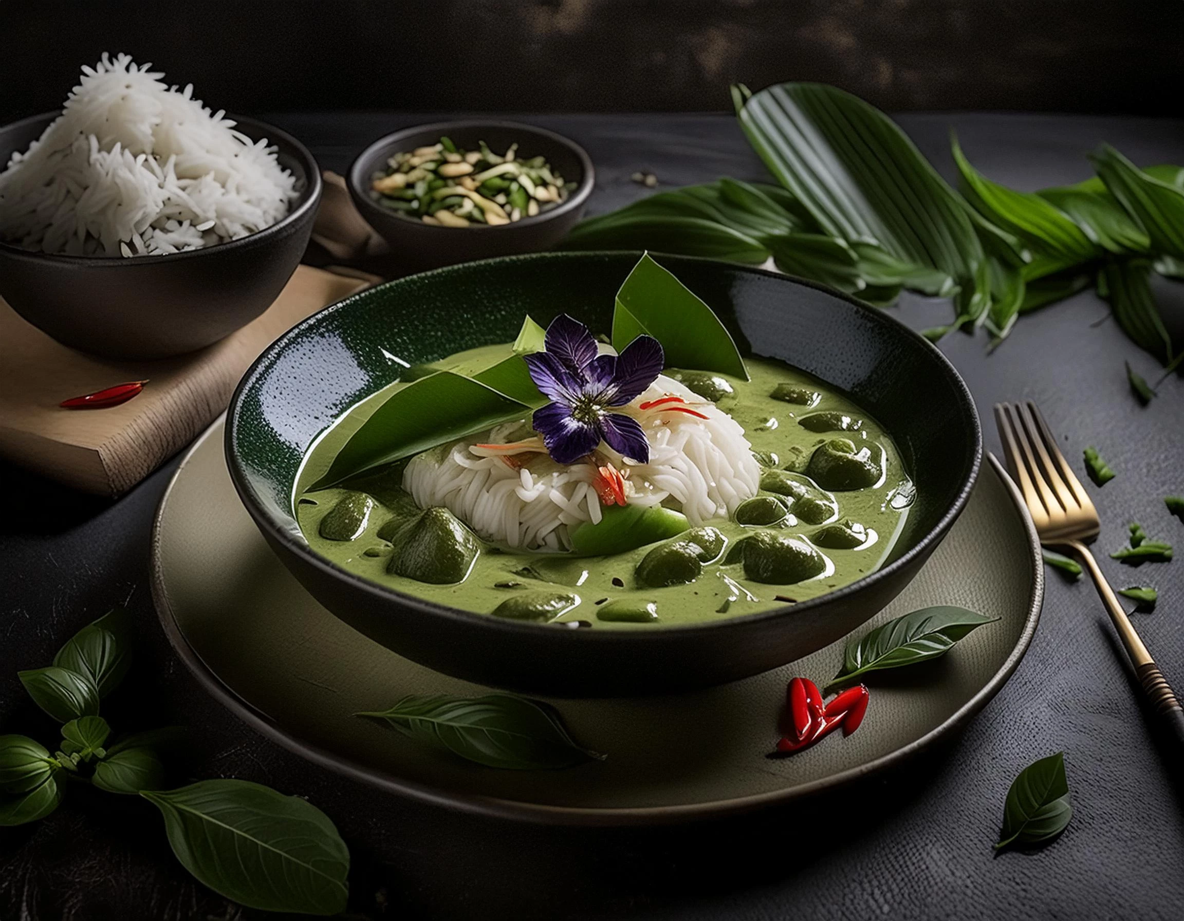 Superbly delicious thai green curry and jasmine rice, Delicious Food Photography, dark noble place setting, sharp-focus, high-quality world-class cuisine, hdr.