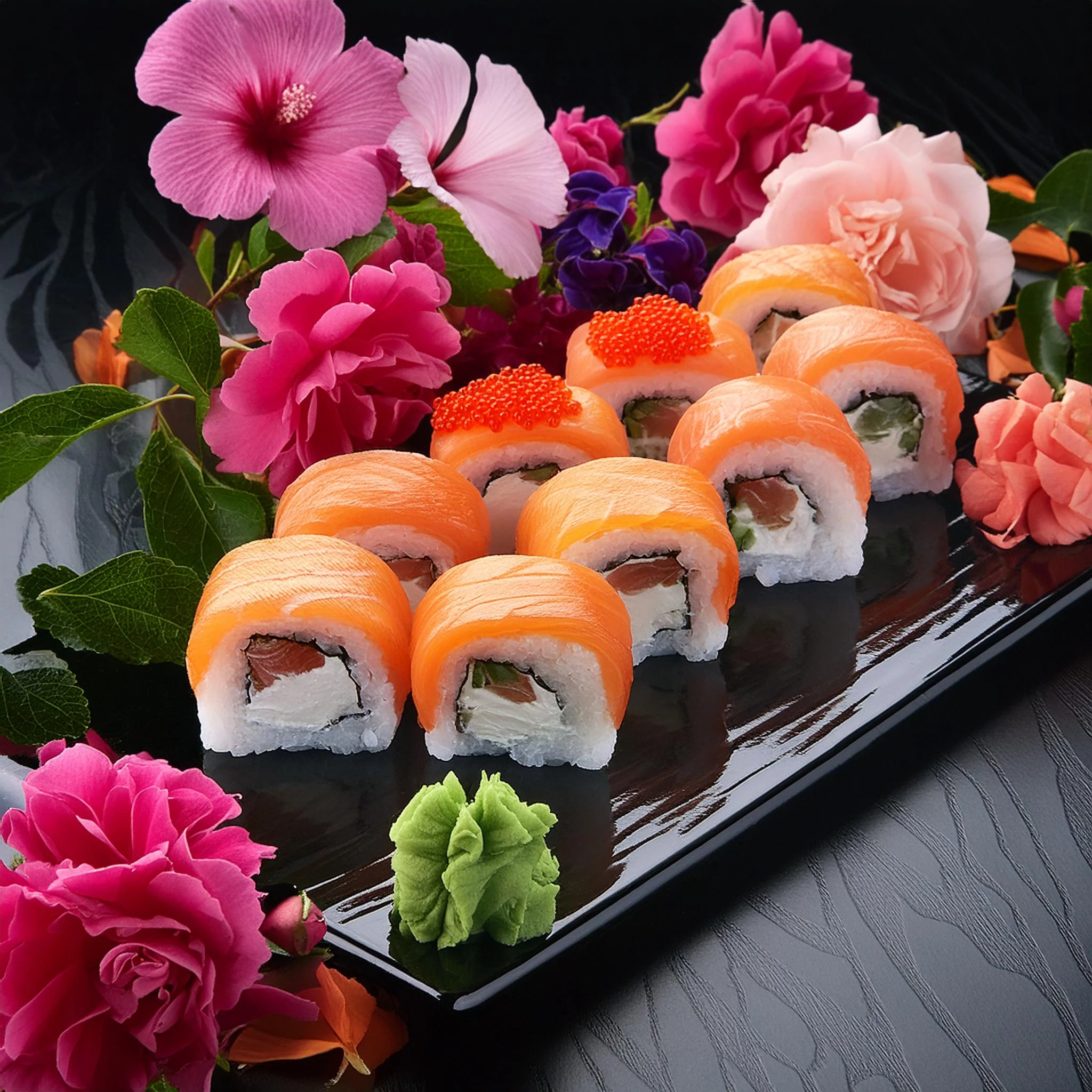 Prompt: sushi on a black shiny platter with a colorful floral presentation