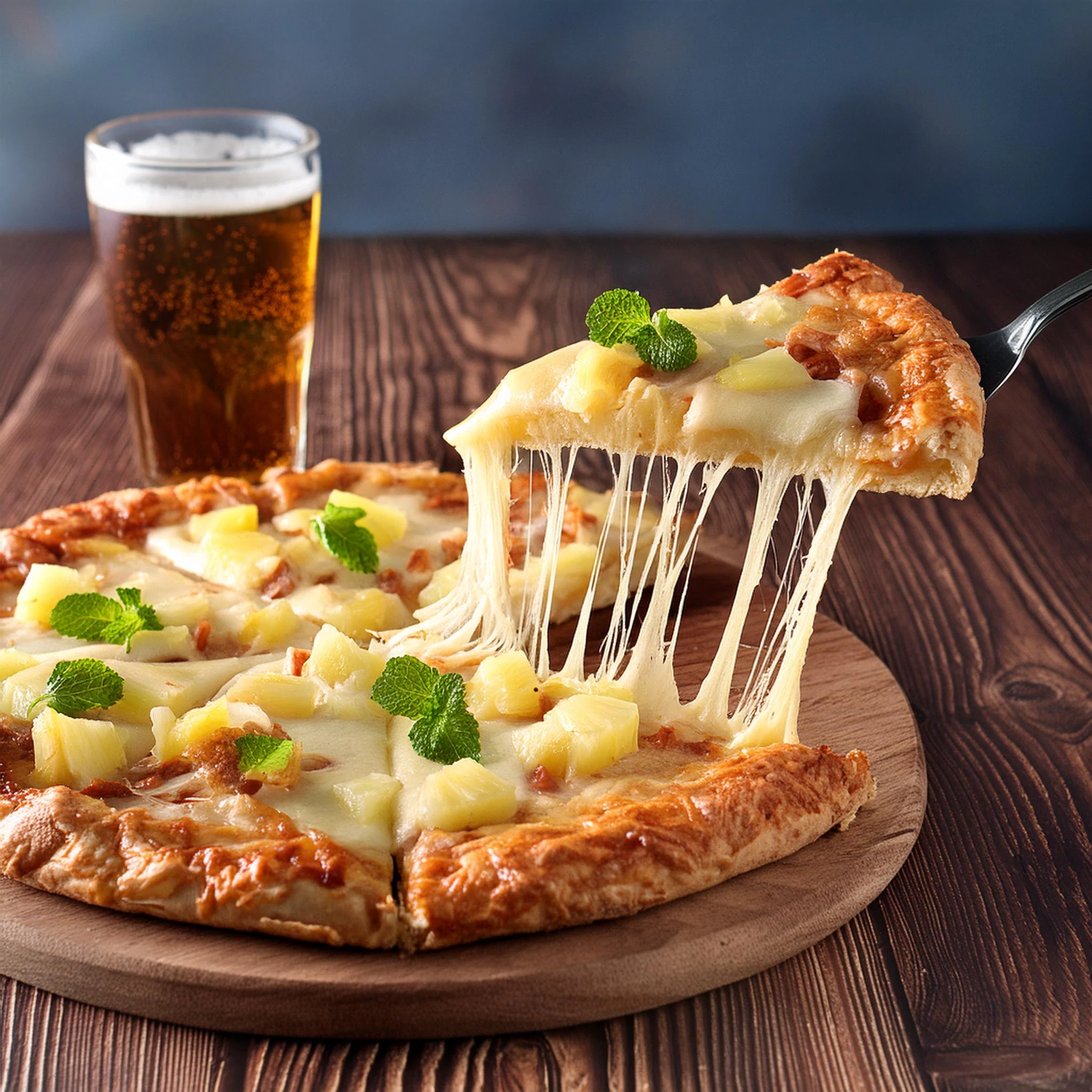 Prompt: Fancy Hawaiian pizza, photo realistic. Slice being lifted with stringy cheese, on a wooden table, with a glass of root beer