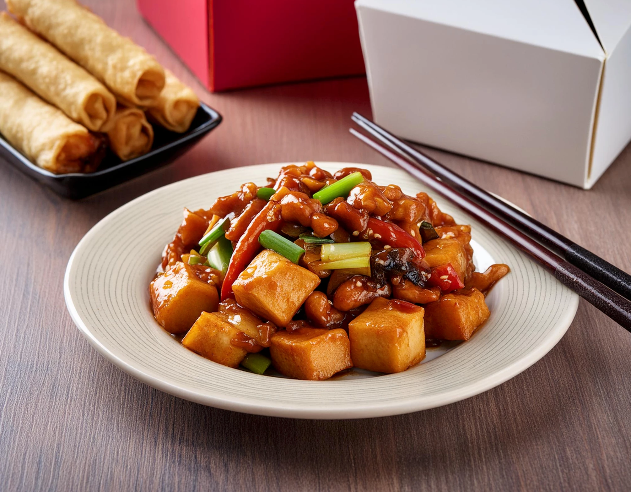 Plate of Kung Pao chicken dish with one eggroll on the side and Chinese takeout boxes in the background; chopsticks resting on plate.