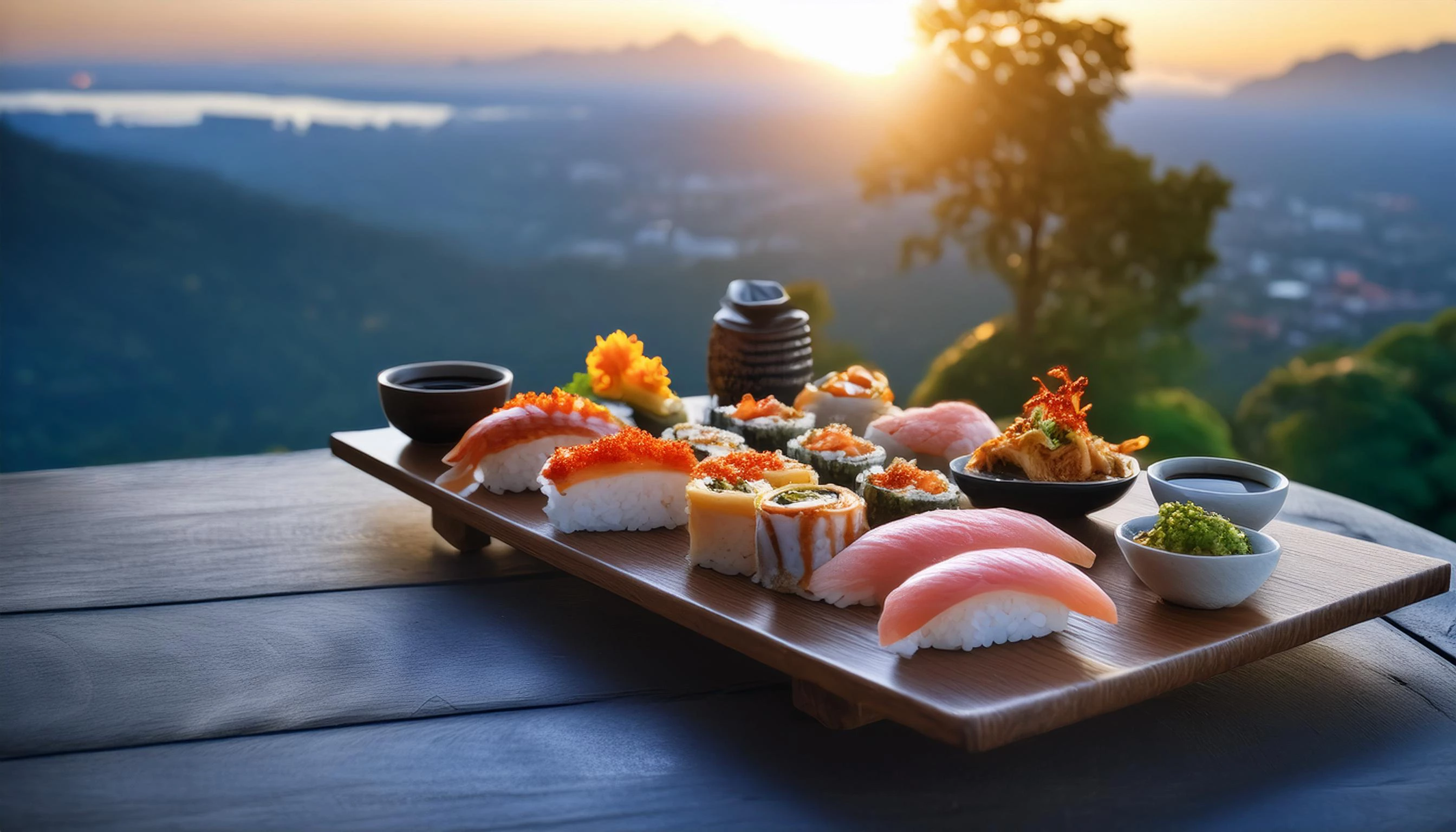 This sushi dinner, featuring an array of exquisite dishes, looks absolutely divine in the golden light of the setting sun.