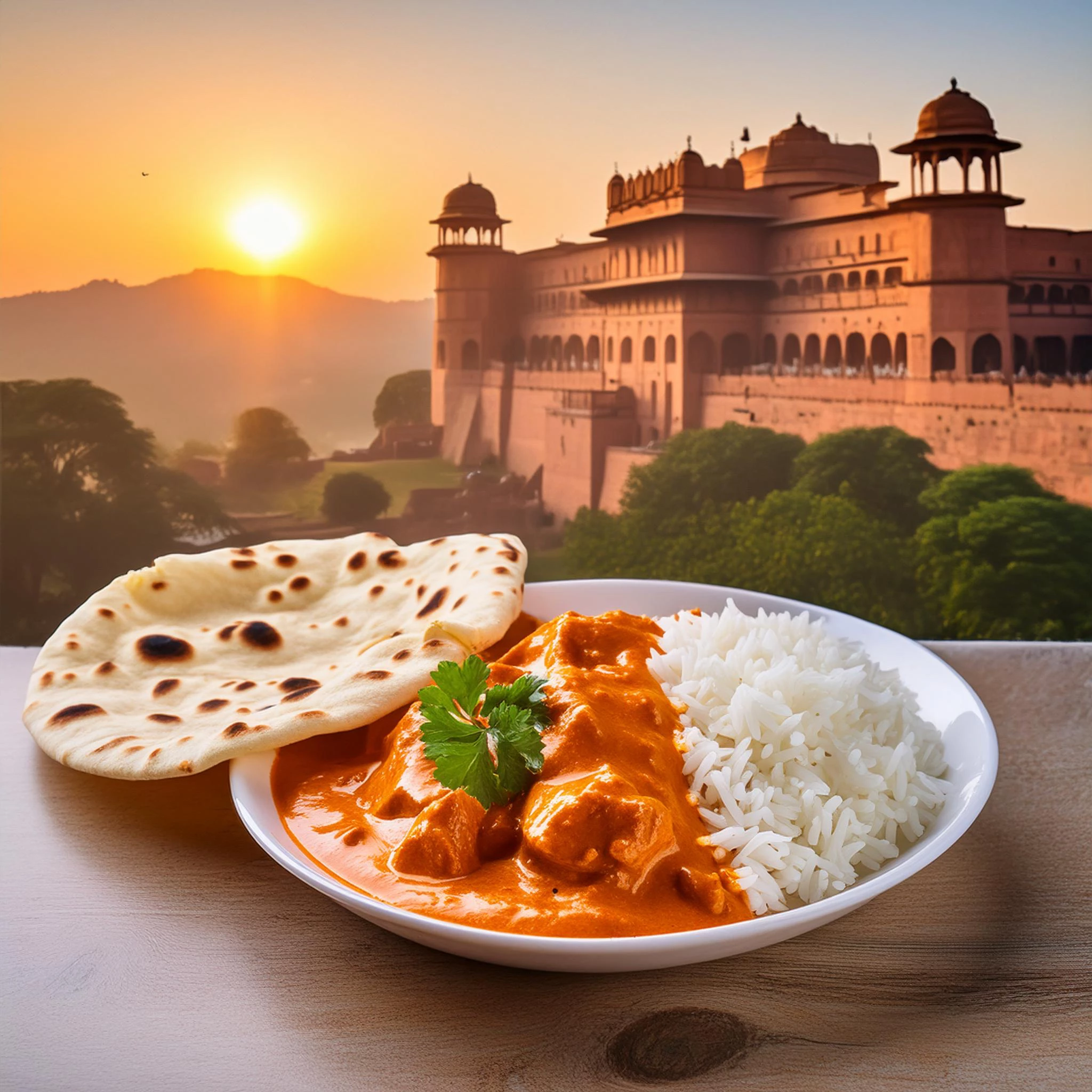 It is simply breathtaking to enjoy chicken tikka masala with rice and naan against a stunning sunset backdrop, with an iconic palace in view.