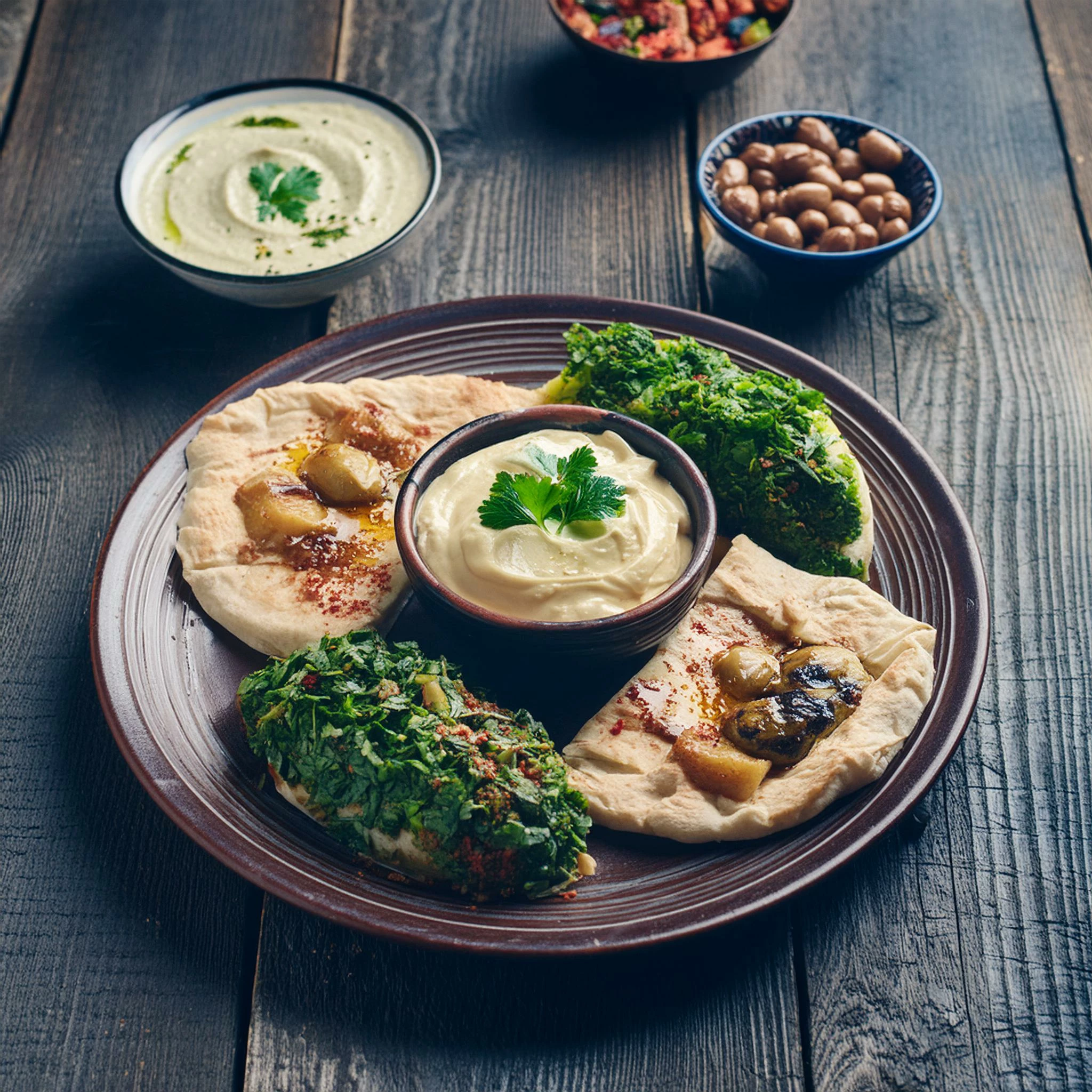 een bord met Libanese gerechten en humus, op een rustieke houten tafel