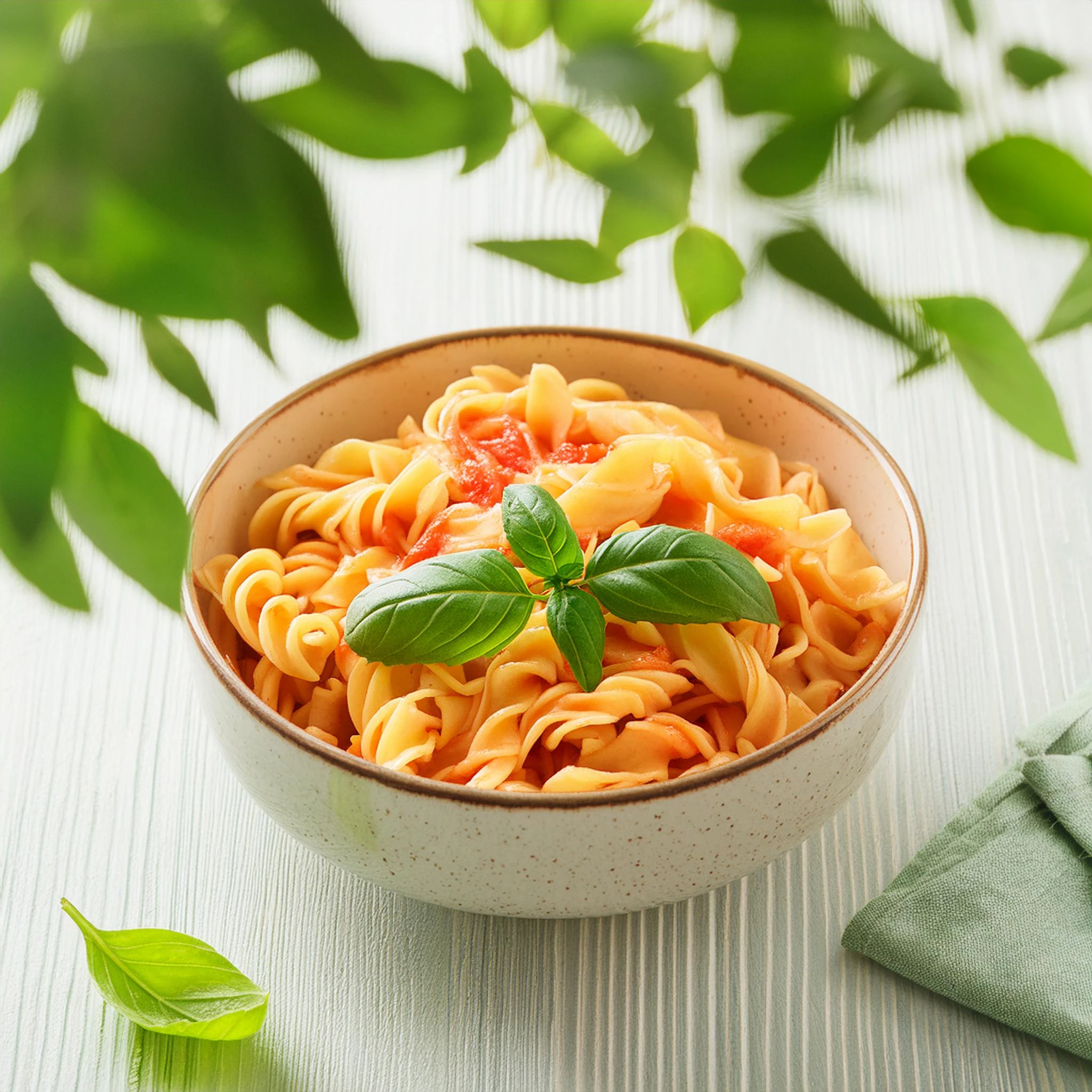 a bowl tasty pasta with tomato sauce with two basil leaves in the middle; photographed against light wood background and plant decoration, close up