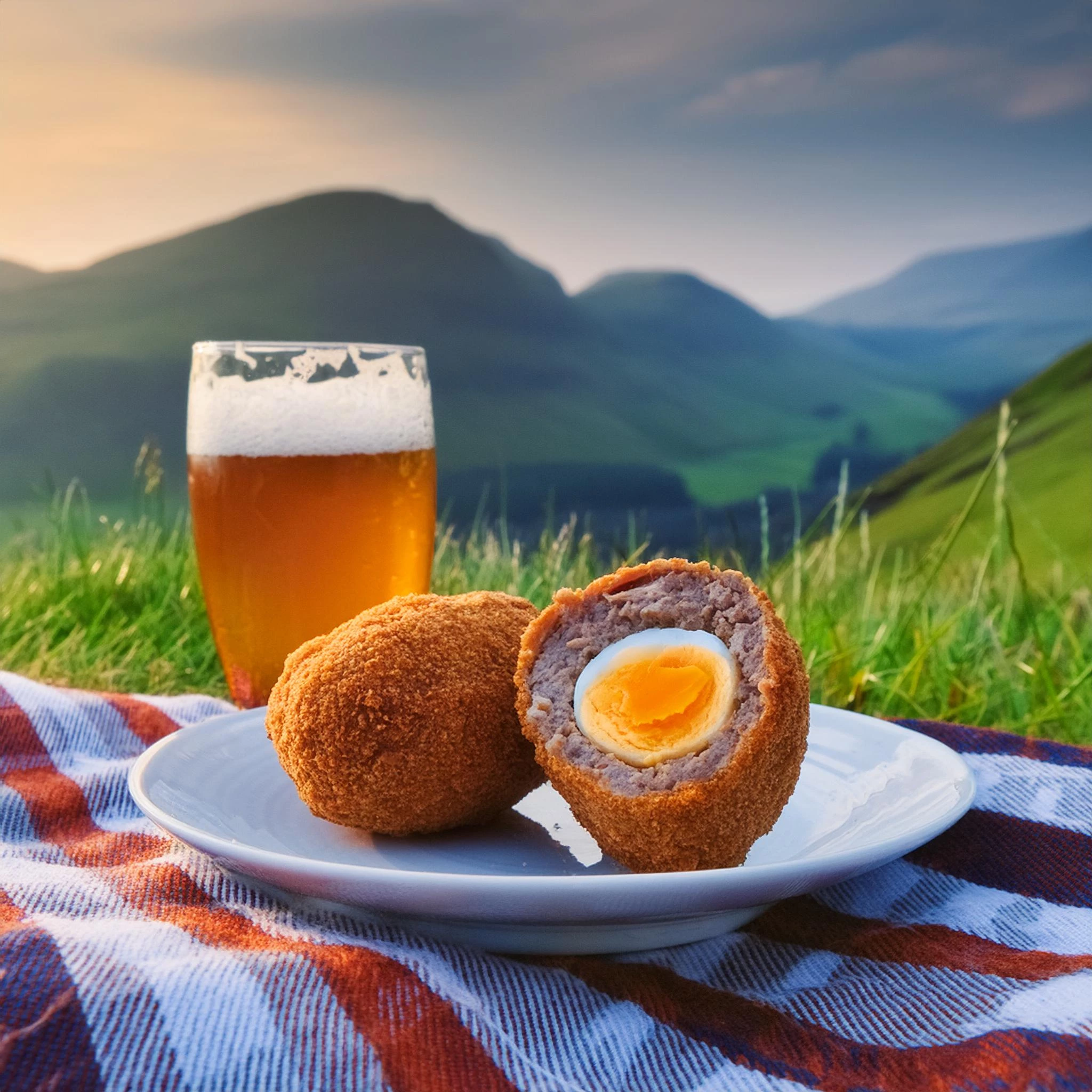 Prompt was: A scotch egg on a plate with a glass of beer on a picnic rug on a scottish hillside with mountains in the distance