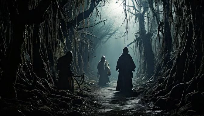 Prompt: dark sleepy hollow with scary creepy people