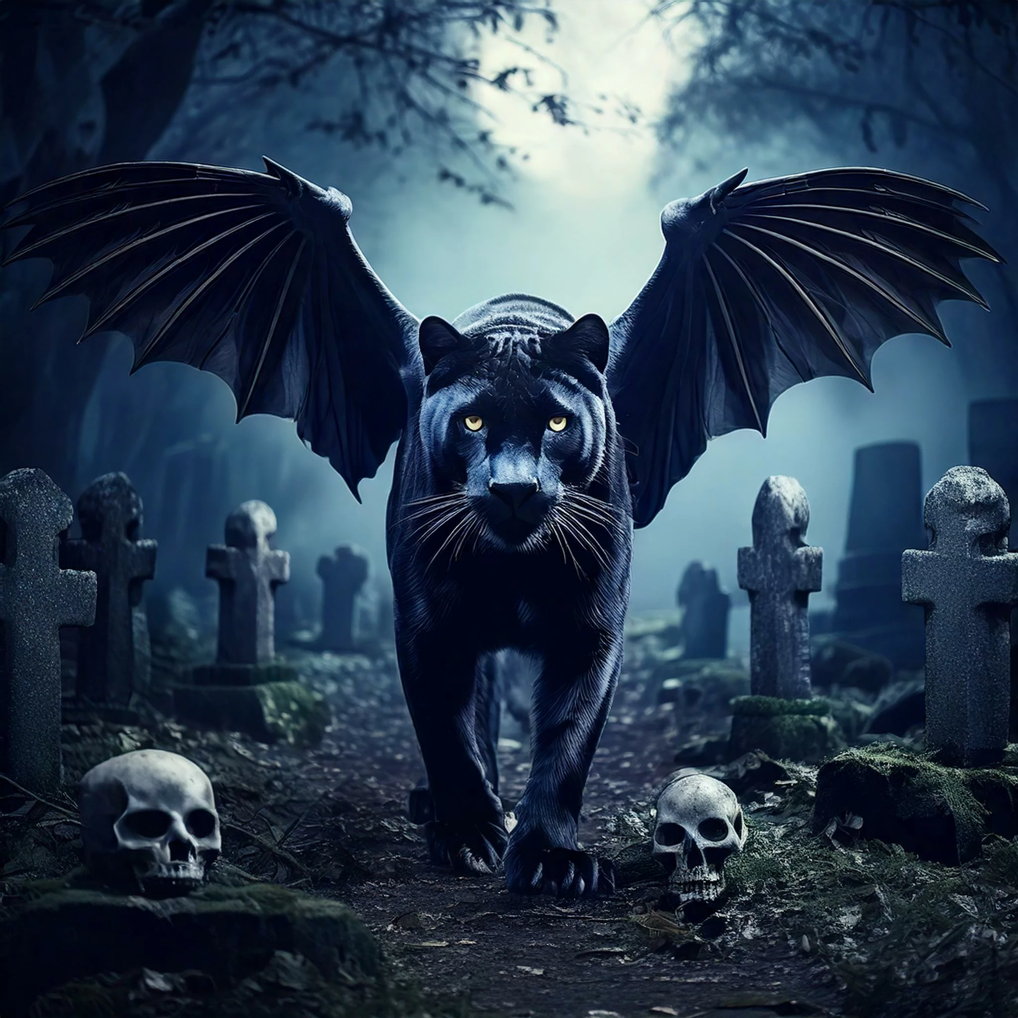 Leaving the pumpkins behins- Prompt: Ominous black panther with bat style wings walking in a Celtic graveyard at midnight; fantasy, skulls laying around on the ground