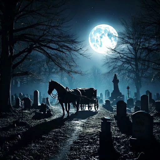 a darkly lit cemetery, a full moon shines on the tombstones, a horse is pulling a carriage with a casket
