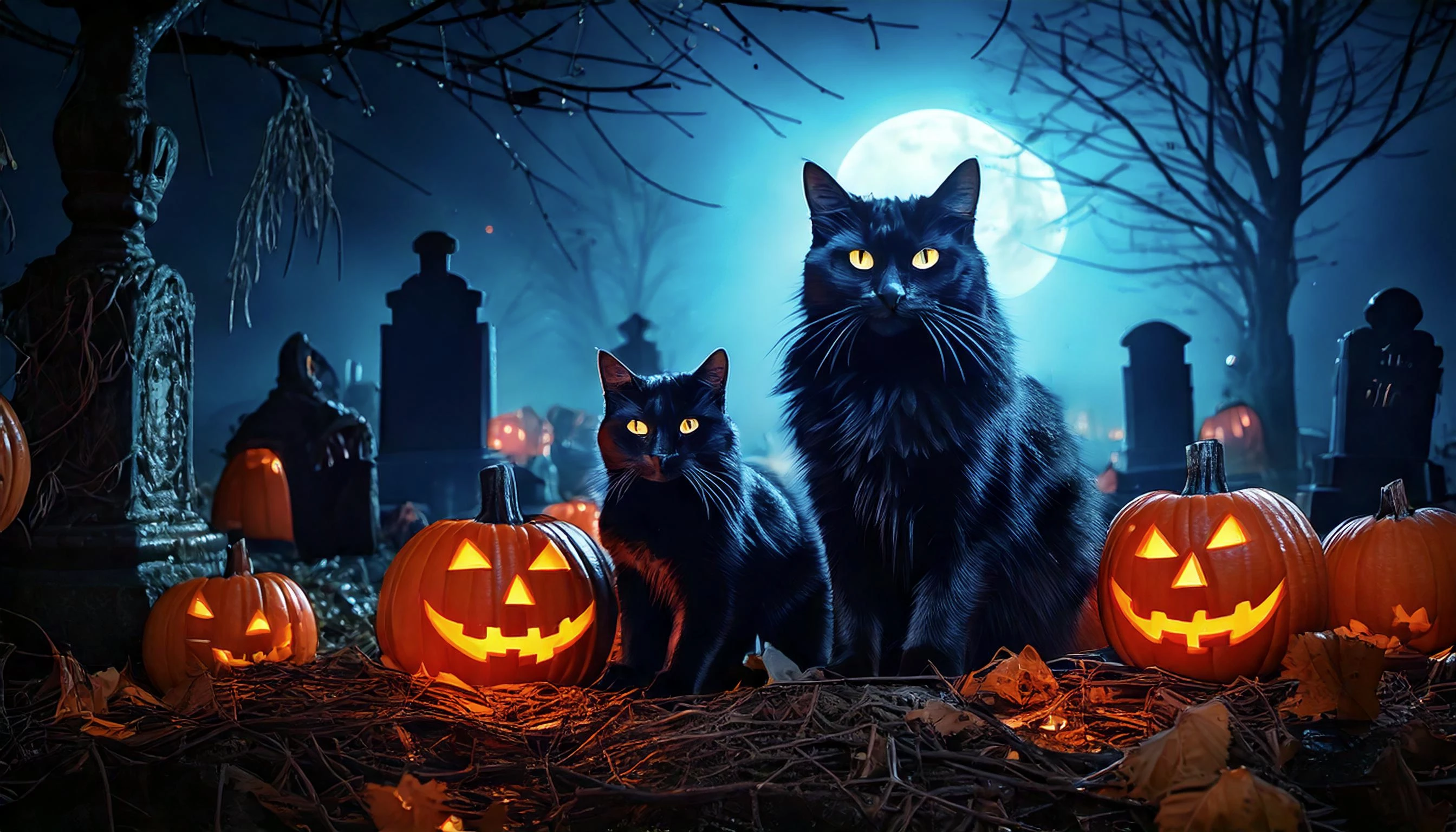 Didn't had much inspiration so for the prompt : "Night scene. Spooky black cats, with jack-o’-lanterns glowing ominously in a cemetery. Include scarecrows, and a misty background to set the scene. include Copy space" Obviously I didn't ask right for copy space