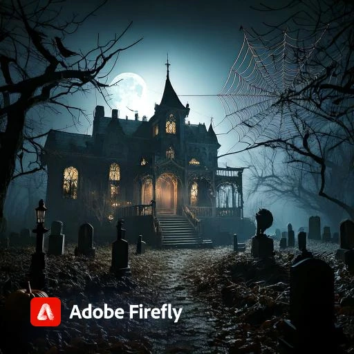 Create a hauntingly eerie image of an abandoned, dimly lit mansion on a stormy night, with ghostly figures lurking in shadows, thick cobwebs, creaking doors, flickering lanterns and candles, a graveyard in the foreground with weathered headstones, eerie fog, creepy trees looming in the background, and a full moon casting an ominous silver glow, incorporating muted colors, deep shadows, and an atmosphere of foreboding and dread.