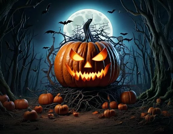 create a spooky night scene with an evil pumpkin, overgrown with branches, bats flying around, spiders crawling in the foreground, halloween, ghosts lurking in the background